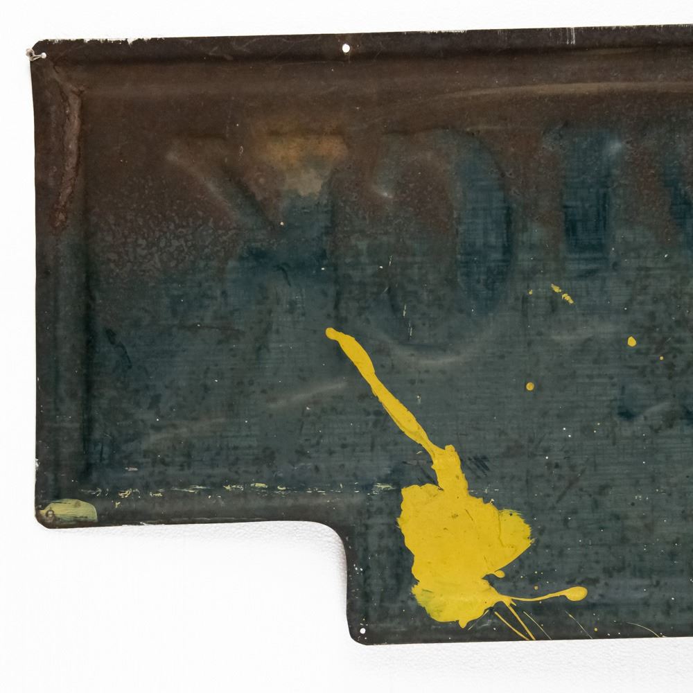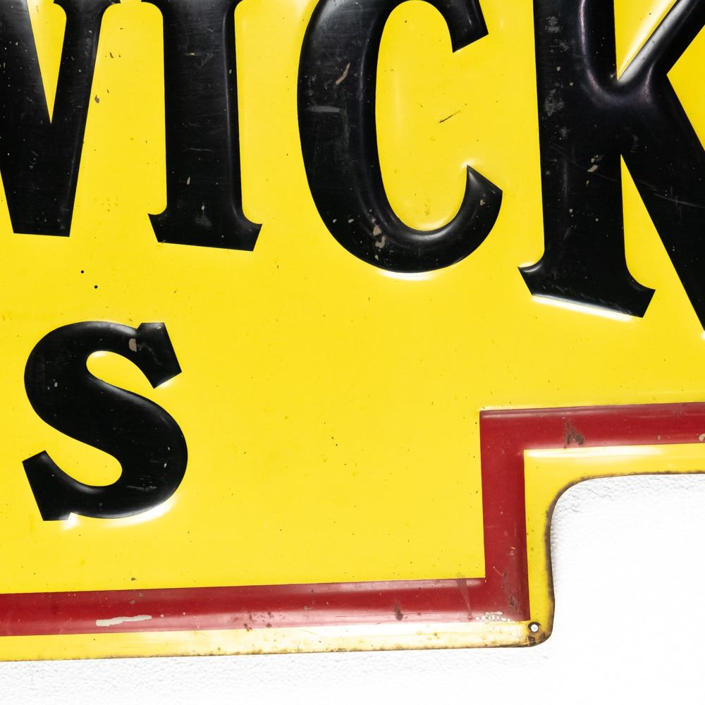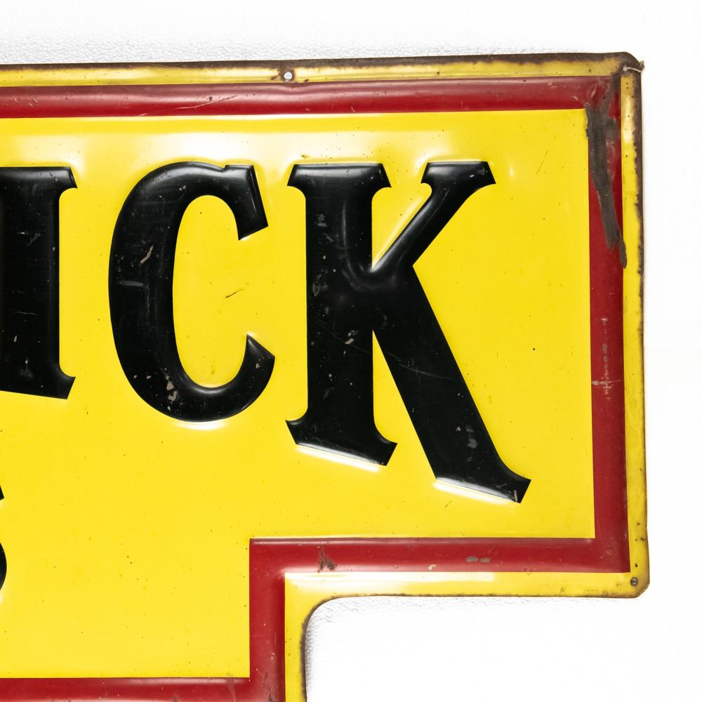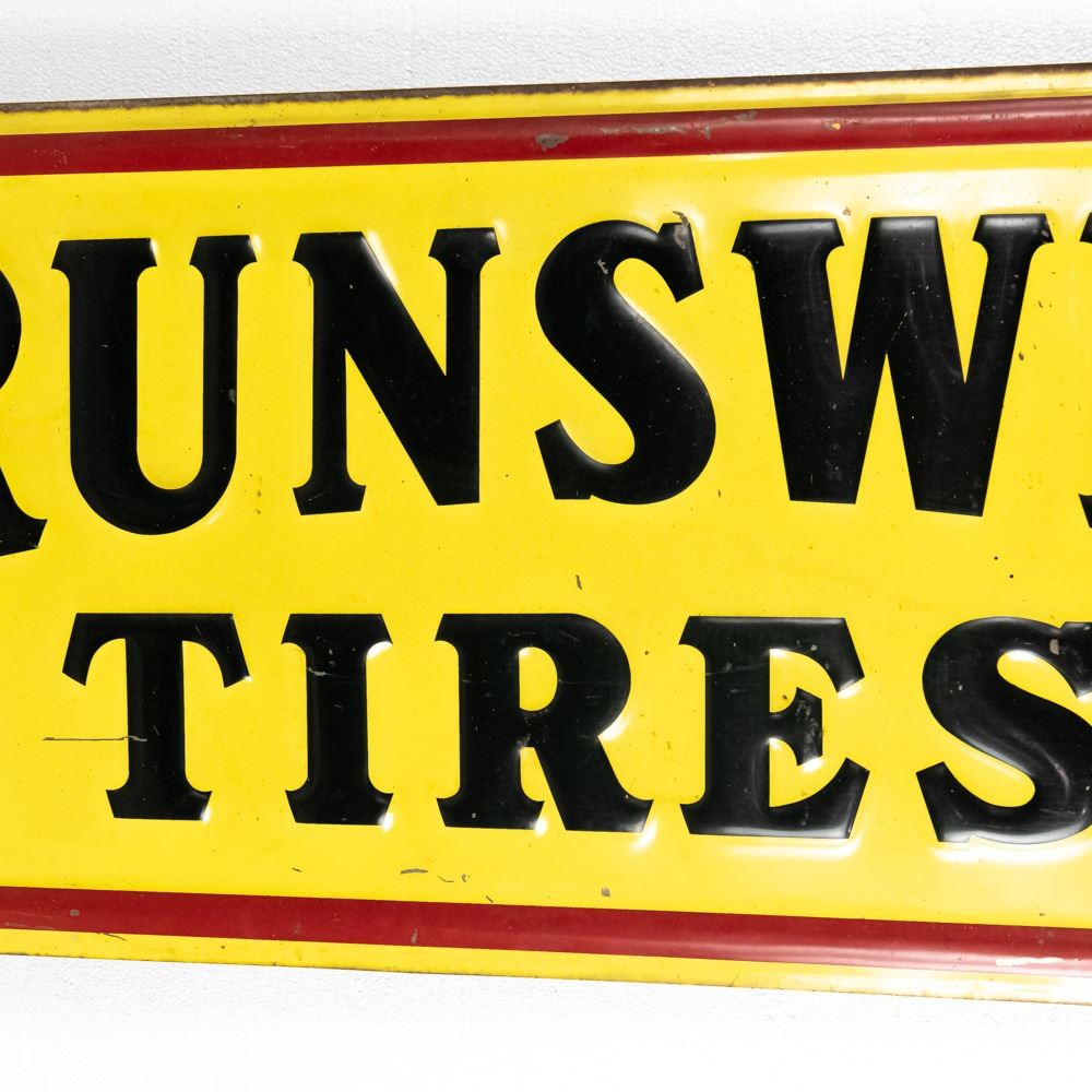 Large and in charge "Brunswick Tires" single sided, embossed metal advertising sign. Good overall condition with some discoloration, scratches, chipped paint / loss and oxidation. Approximately 20"t x 60"l. Please use photos to judge condition and bid accordingly.