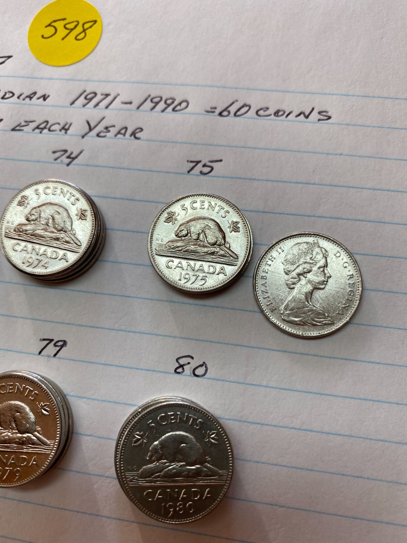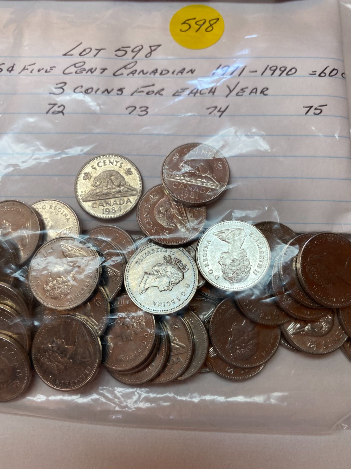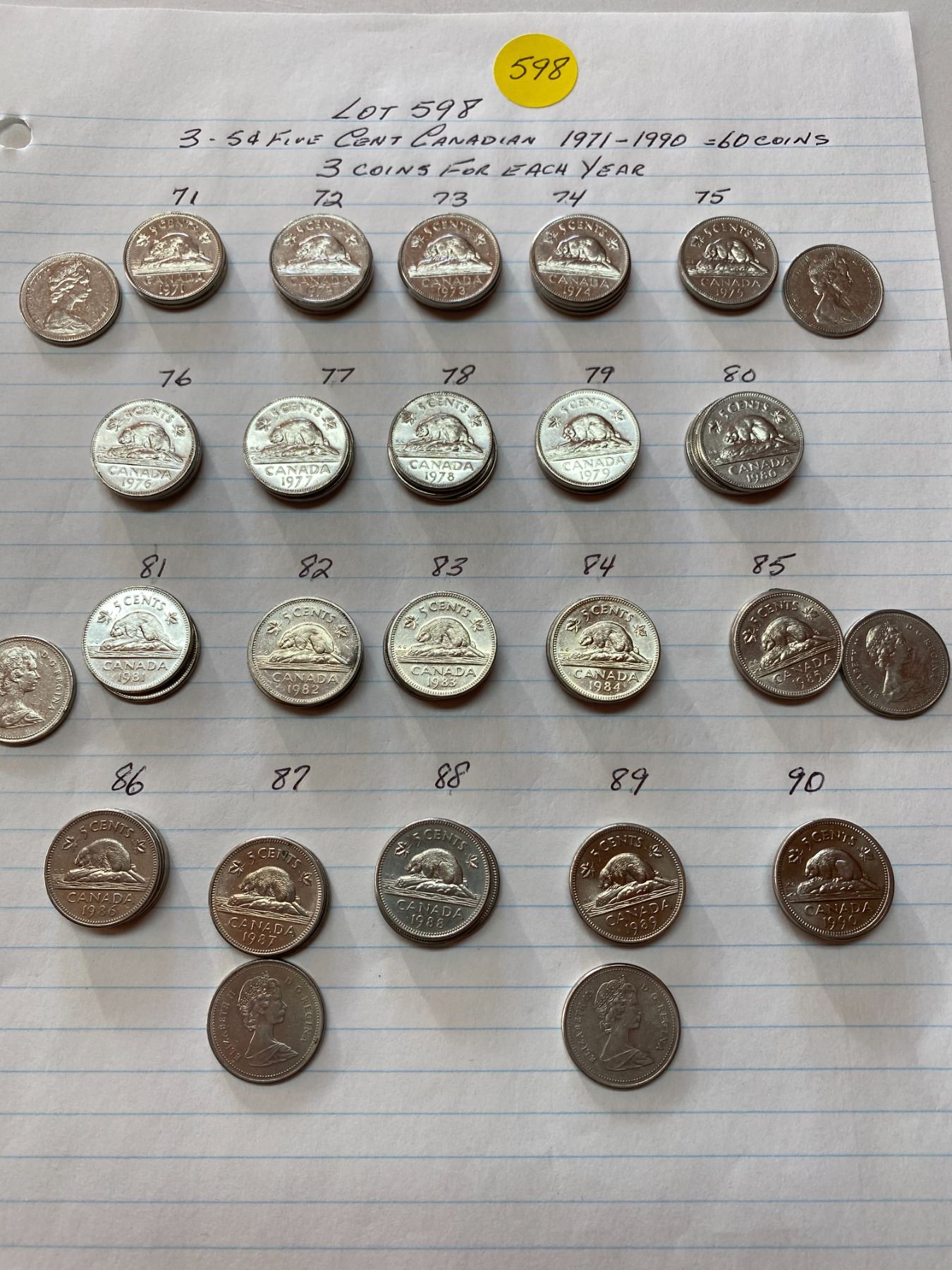 60 Canada five cent pieces, 3 coins for each year 1971-1990