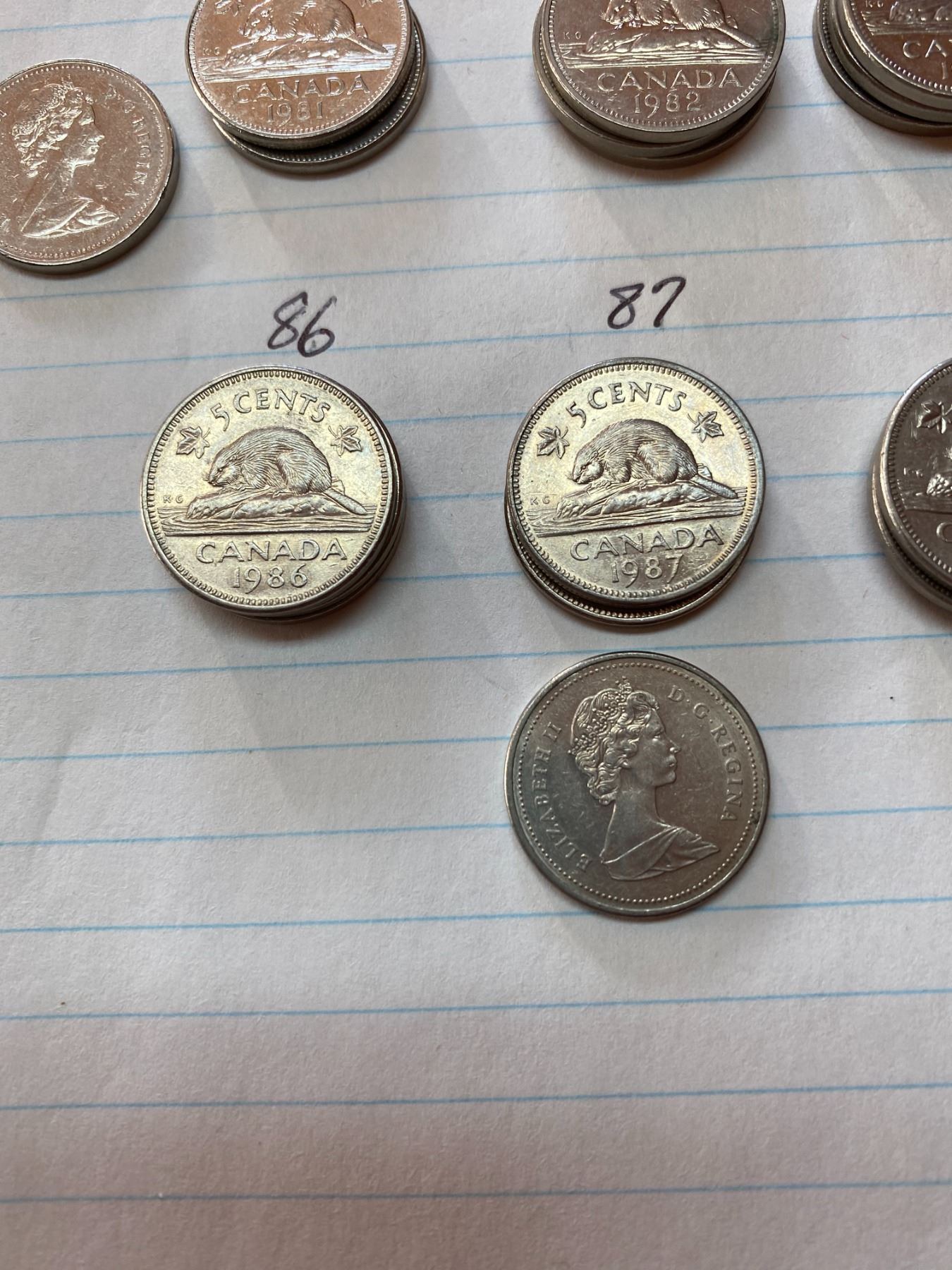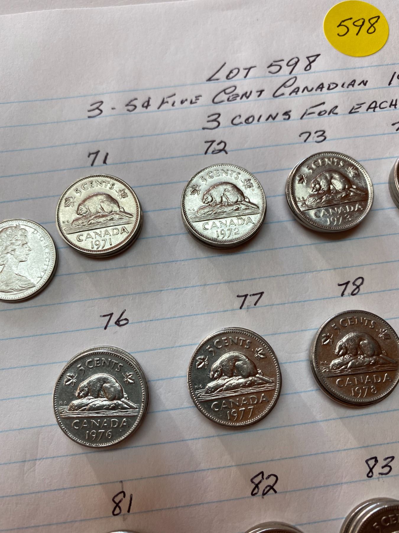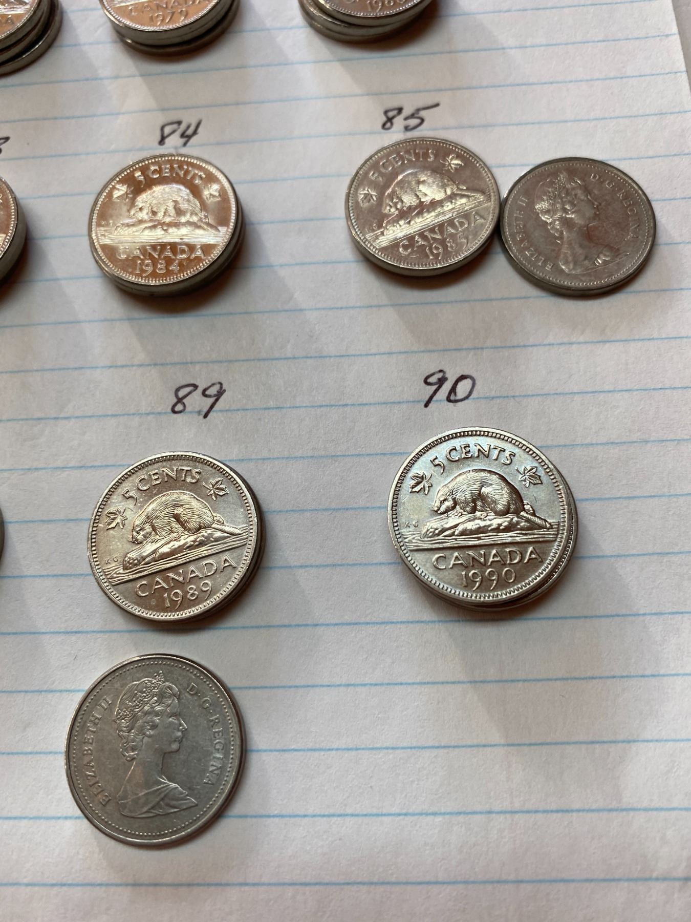 60 Canada five cent pieces, 3 coins for each year 1971-1990