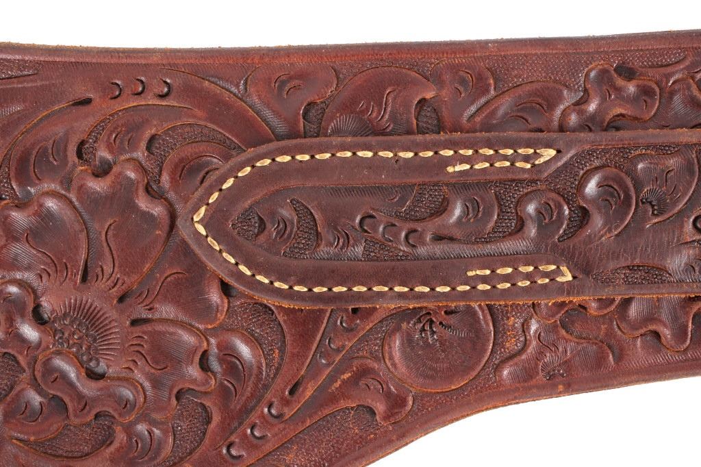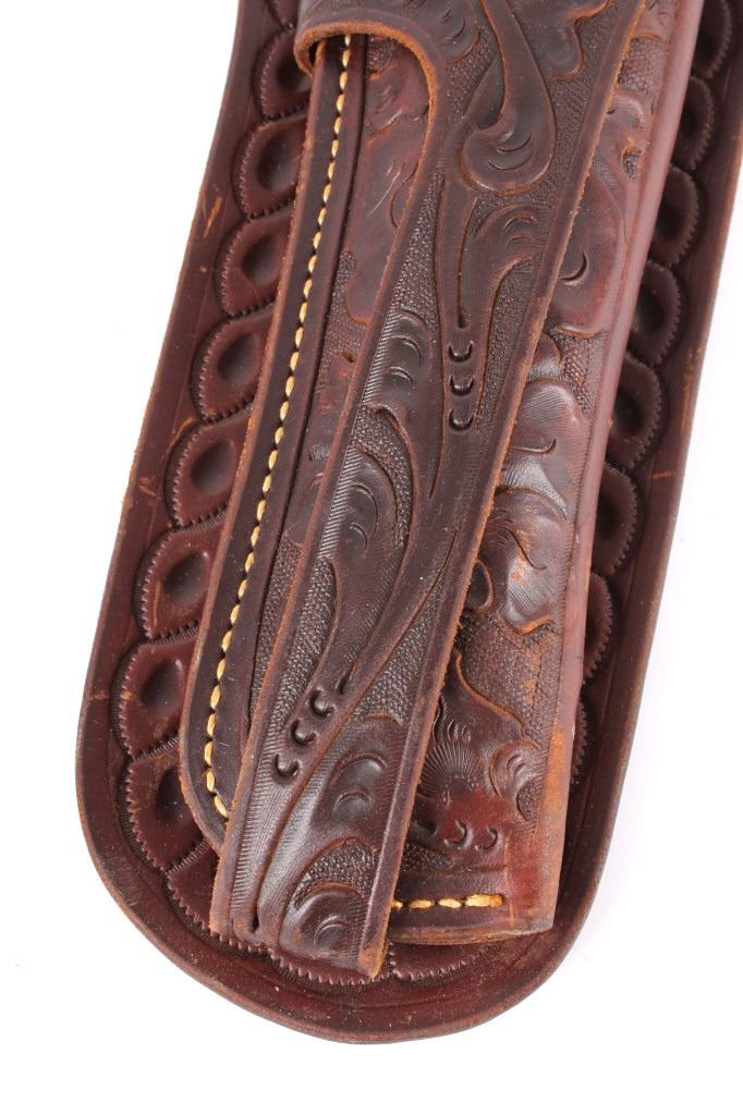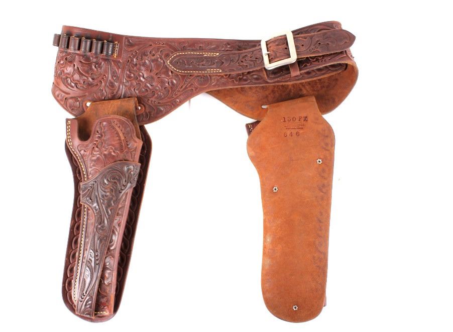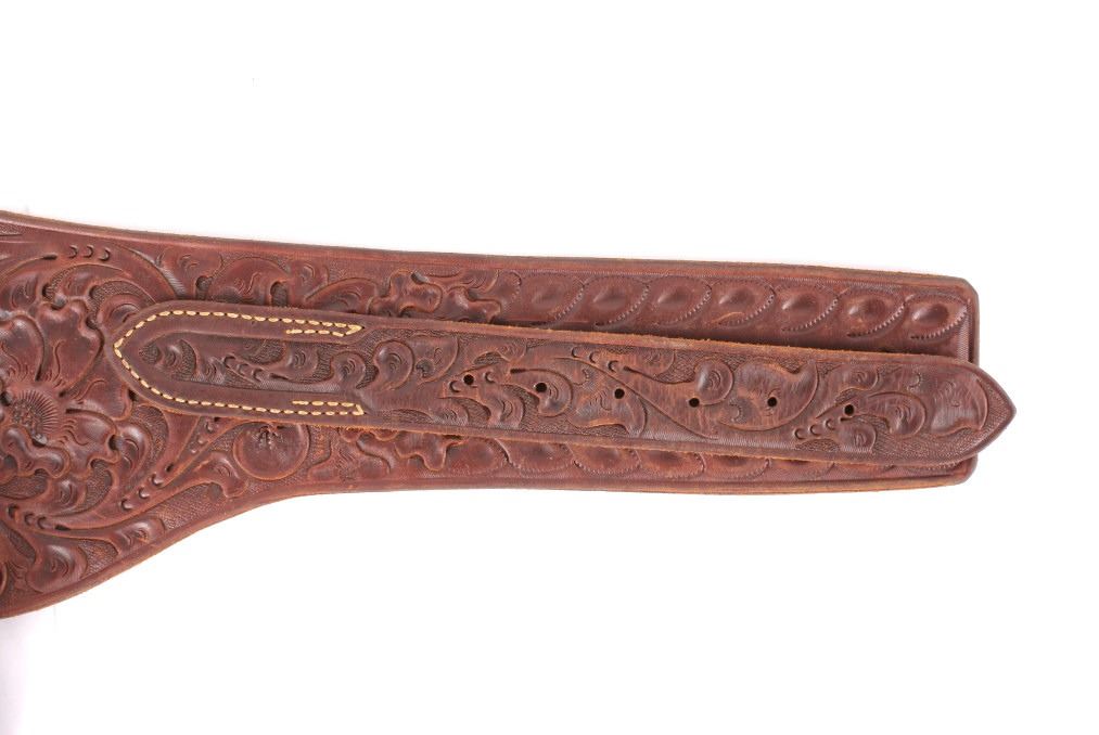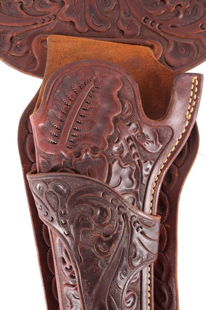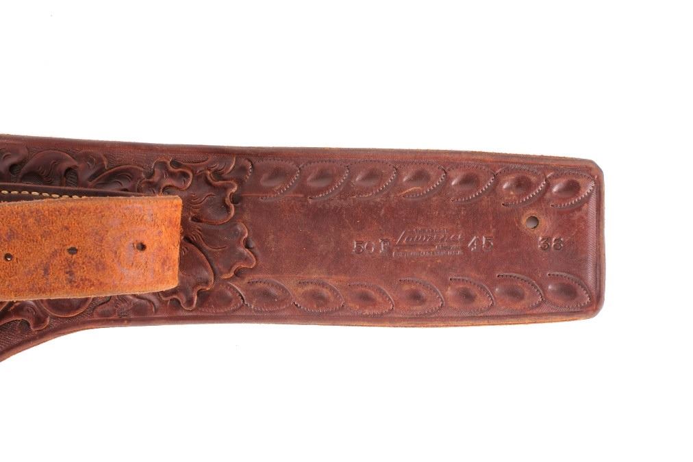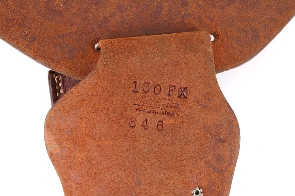 For your consideration is this double gun holster and ammo belt from George Lawerence Co. circa 1960's. The George Lawrence Company of Portland, Oregon, a saddlery, harness and leather goods firm established in 1857 and incorporated in 1893. George Lawrence was one of the largest makers of leather goods in the West. The holster and ammo belt shows well preserved brown leather with sinew stitching and a smooth finish. he belt and holster are each marked "The George Lawrence Company - Portland. Oregon. U.S.A. 50F - 45 - 38 - 130F - 646 - 130FX - 646. The two gun rig shows a really nice floral western tooling pattern to the holsters and the ammo belt and shows a single loop design for each of the holsters. The condition of this of this belt and holster is pristine with a wonderful preservation to The measurements of this holster and belt