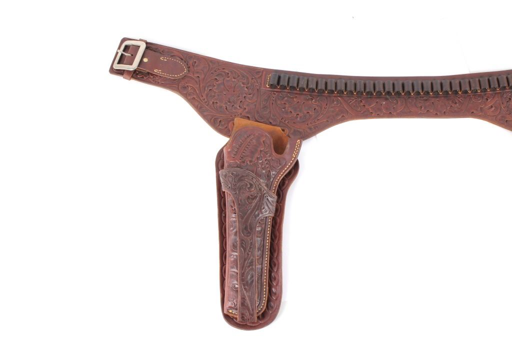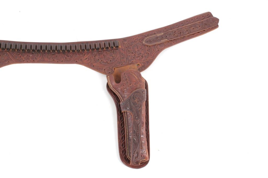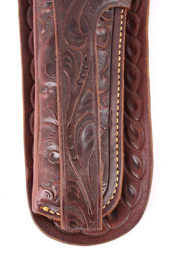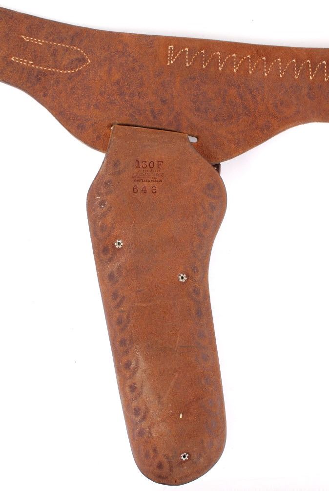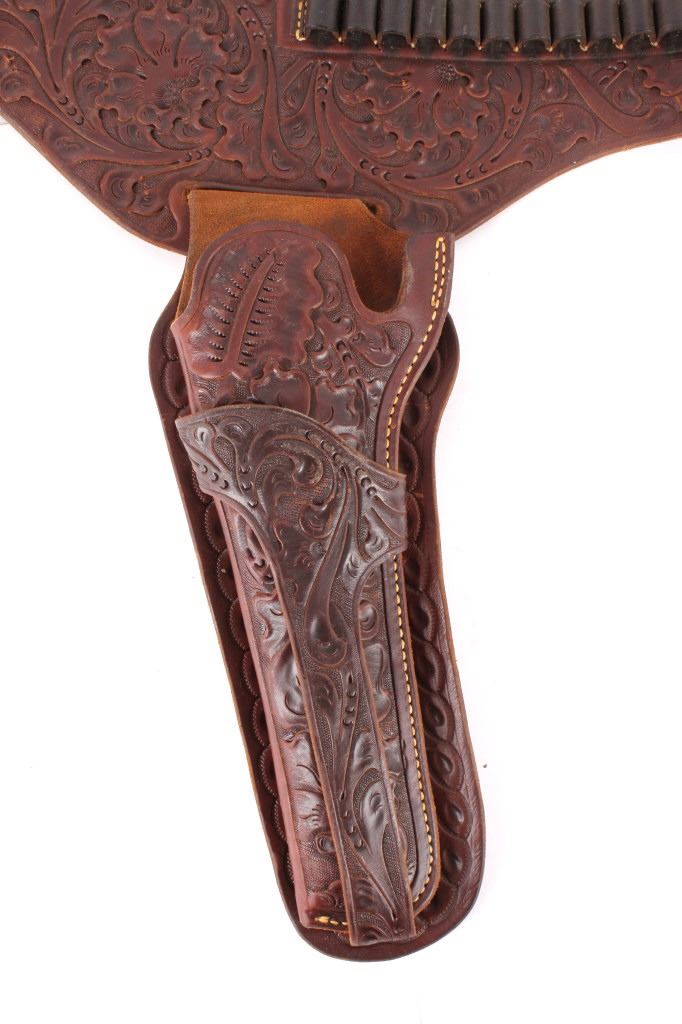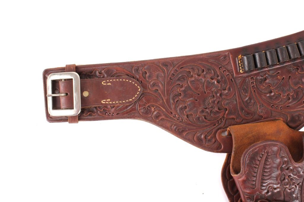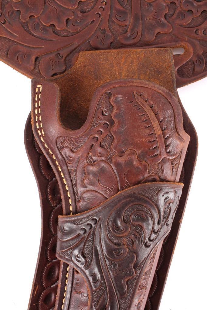 For your consideration is this double gun holster and ammo belt from George Lawerence Co. circa 1960's. The George Lawrence Company of Portland, Oregon, a saddlery, harness and leather goods firm established in 1857 and incorporated in 1893. George Lawrence was one of the largest makers of leather goods in the West. The holster and ammo belt shows well preserved brown leather with sinew stitching and a smooth finish. he belt and holster are each marked "The George Lawrence Company - Portland. Oregon. U.S.A. 50F - 45 - 38 - 130F - 646 - 130FX - 646. The two gun rig shows a really nice floral western tooling pattern to the holsters and the ammo belt and shows a single loop design for each of the holsters. The condition of this of this belt and holster is pristine with a wonderful preservation to The measurements of this holster and belt