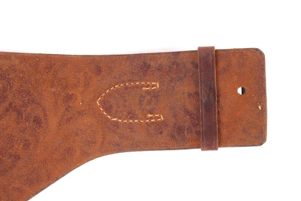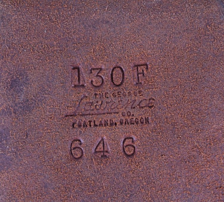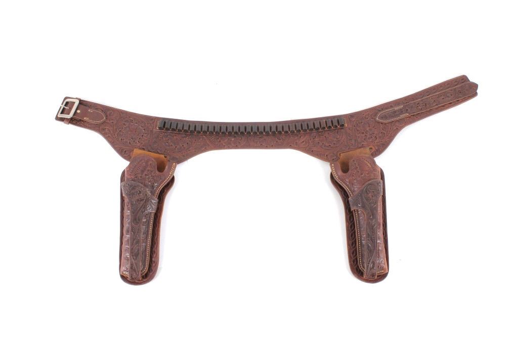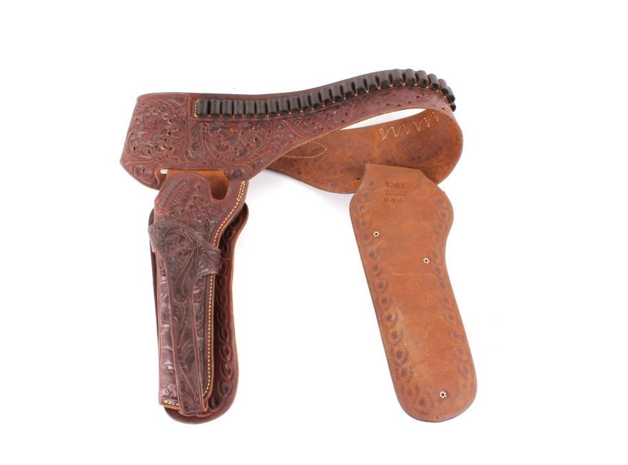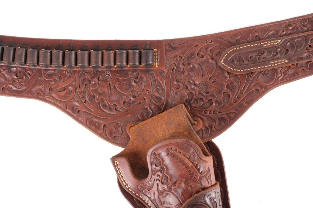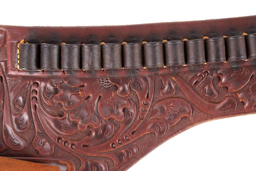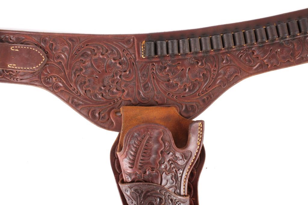 For your consideration is this double gun holster and ammo belt from George Lawerence Co. circa 1960's. The George Lawrence Company of Portland, Oregon, a saddlery, harness and leather goods firm established in 1857 and incorporated in 1893. George Lawrence was one of the largest makers of leather goods in the West. The holster and ammo belt shows well preserved brown leather with sinew stitching and a smooth finish. he belt and holster are each marked "The George Lawrence Company - Portland. Oregon. U.S.A. 50F - 45 - 38 - 130F - 646 - 130FX - 646. The two gun rig shows a really nice floral western tooling pattern to the holsters and the ammo belt and shows a single loop design for each of the holsters. The condition of this of this belt and holster is pristine with a wonderful preservation to The measurements of this holster and belt