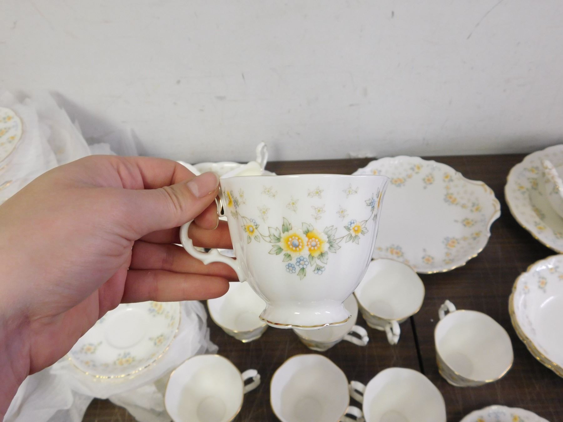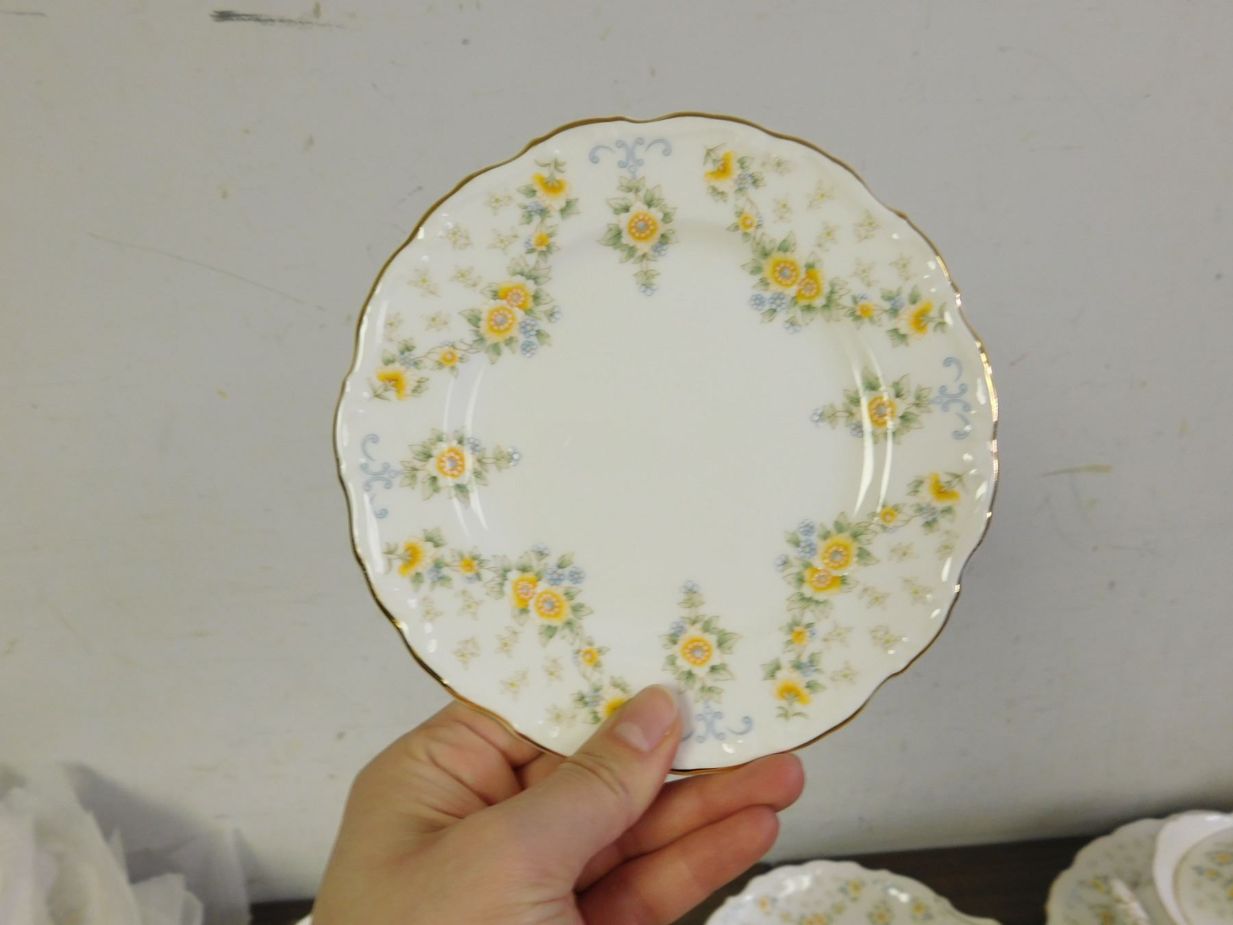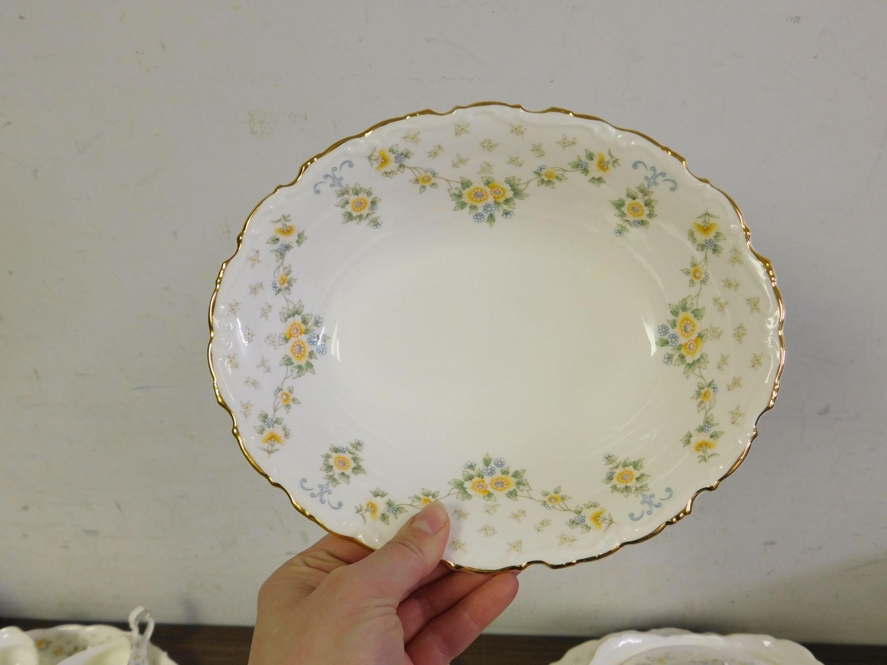 11 Dinner Plates, 10 Bread Butter Plates, 8 Bowls, 2 Sets of Salt Pepper Shakers, 10 Cups and Saucers, Cream and Sugar w Tray, Gravy Boat w Tray, Butter Dish, 2 Oval Serving Bowls, 1 Round Bowl, 1 Handle Plate, 1 Platter, 1 Serving Dish w Lid, 12 Lunch Plates. WILL NOT SHIP