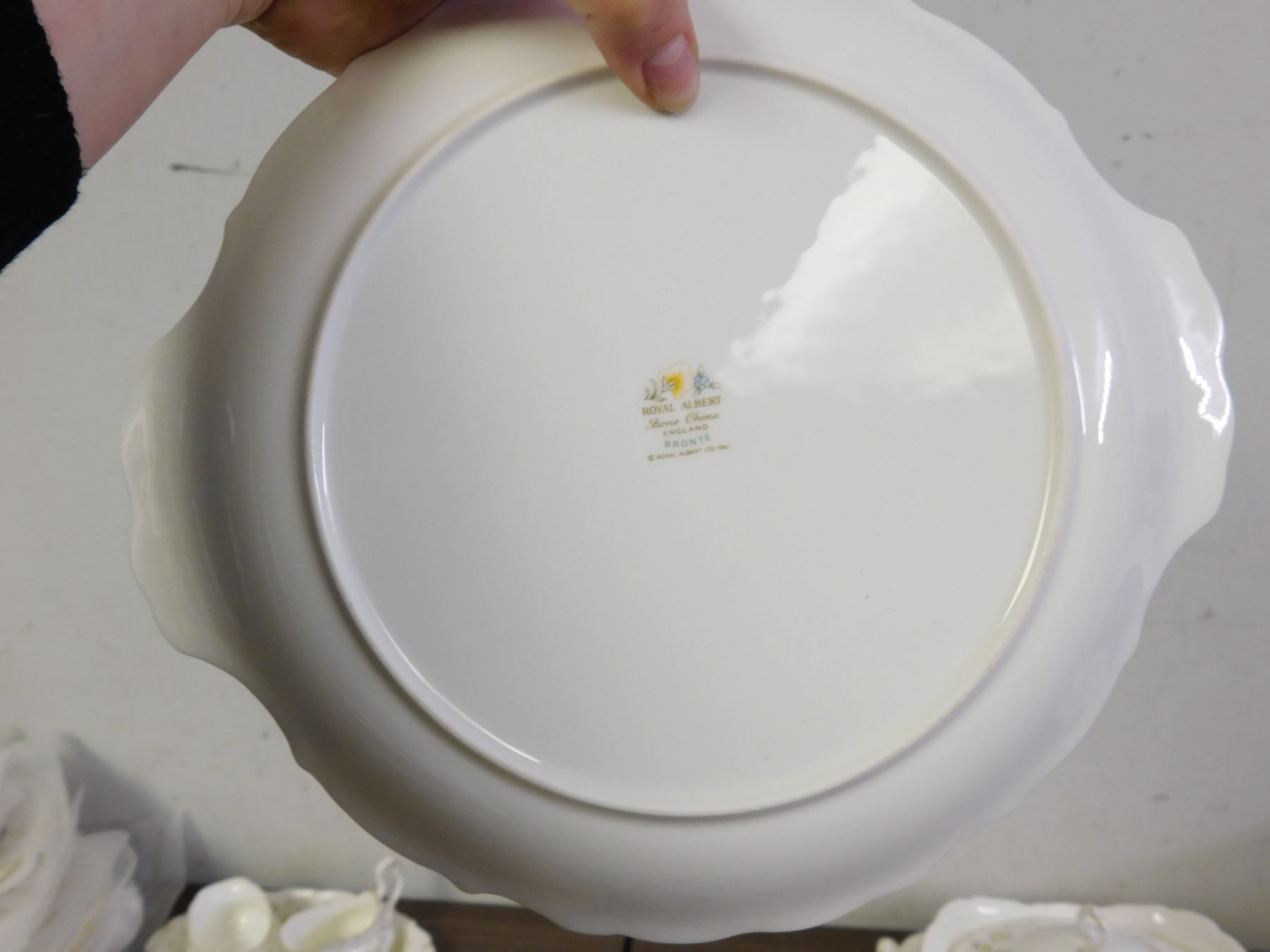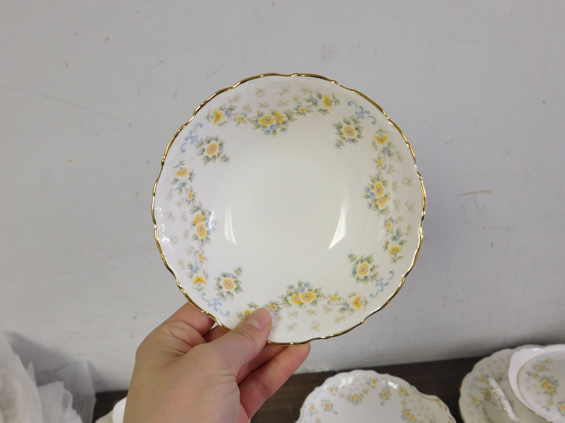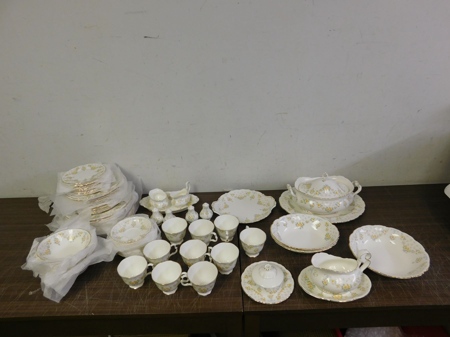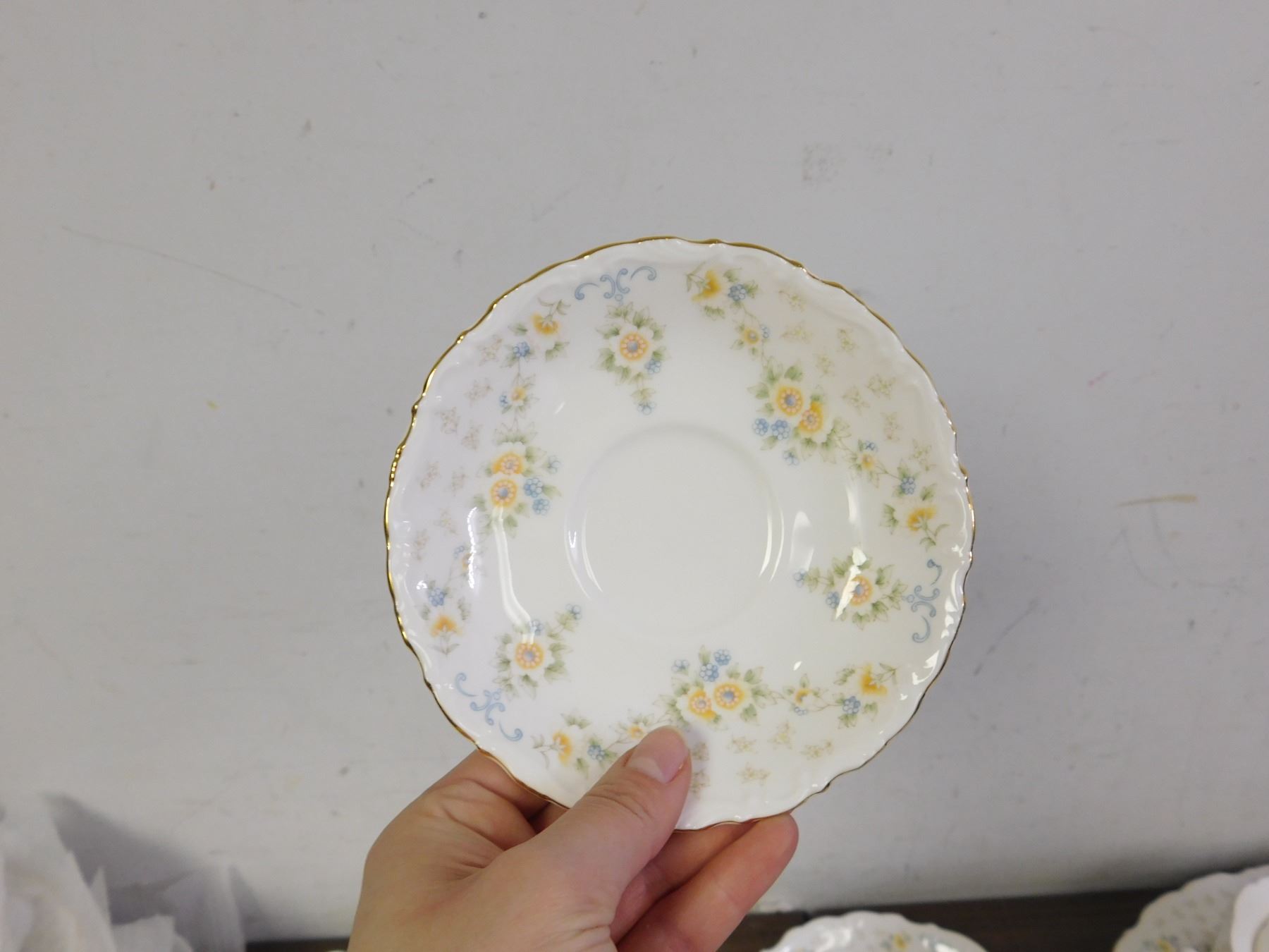 11 Dinner Plates, 10 Bread Butter Plates, 8 Bowls, 2 Sets of Salt Pepper Shakers, 10 Cups and Saucers, Cream and Sugar w Tray, Gravy Boat w Tray, Butter Dish, 2 Oval Serving Bowls, 1 Round Bowl, 1 Handle Plate, 1 Platter, 1 Serving Dish w Lid, 12 Lunch Plates. WILL NOT SHIP