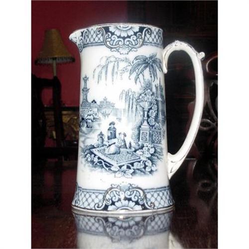 Flow Blue Milk Jug with wonderful pattern on sides and maker's mark on bottom. Mixed of Oriental and European scene on sides, a truly magnificent piece.