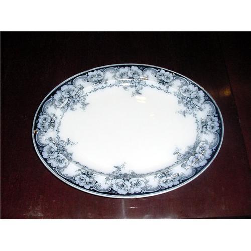 Small Flow Blue Platter 13 inches wide, 16 inches long and 1 1/2 inches deep. Incredibly rich color and very fine detail on foral decorations. Maker's mark on bottom.