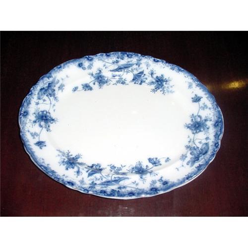 Flow Blue Platter 14 3/4 inches wide, 18 1/4 inches long and 1 1/2 inches deep. Exquisitely delicate floral design on edges with gold accents. Outstanding!
