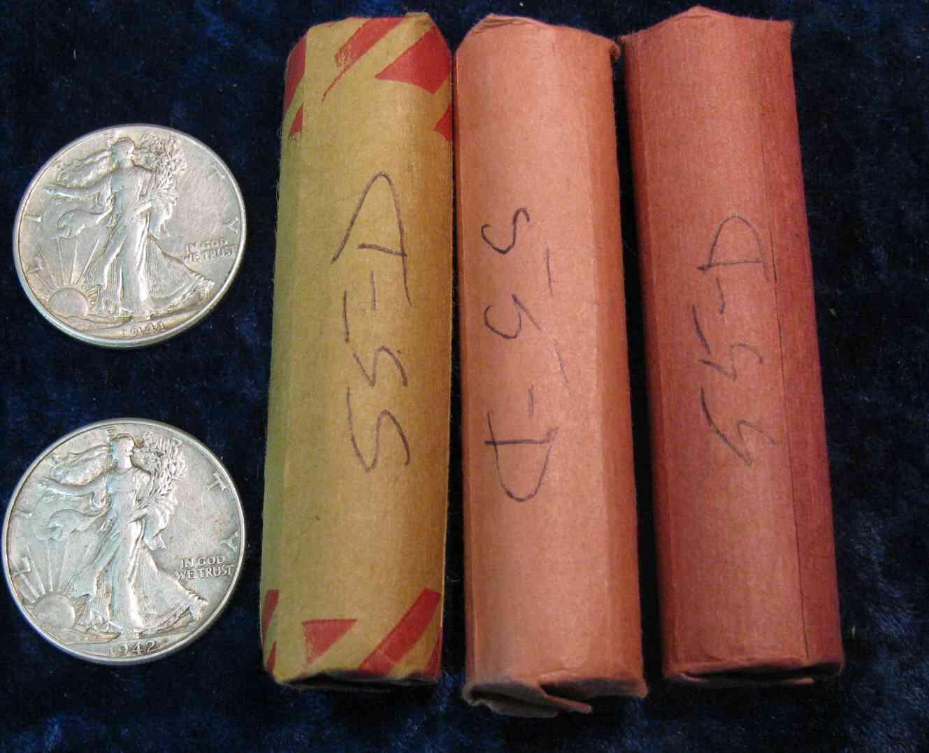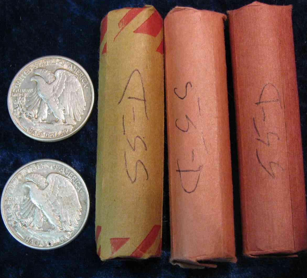 602. (3) 1955D Cent Rolls Circ. & a pair of VF Walking Liberty Half Dollars.