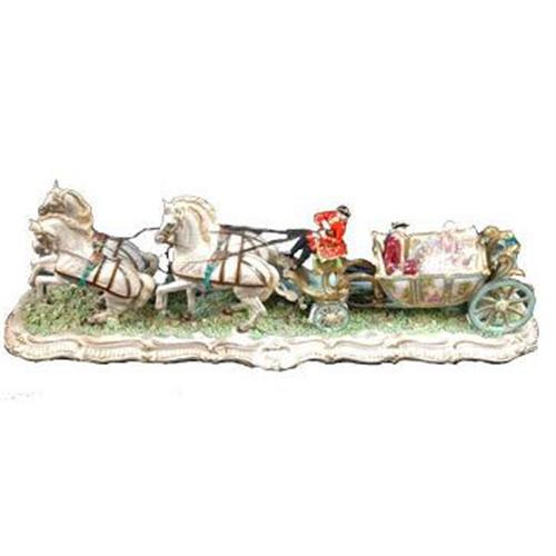 Large Italian porcelain figural group depicting a horse drawn coach with figures of formally dressed people. Signed on the front "Fabris". 28.5" wide, 5.5" deep, 9" tall. Very good condition. Minor losses to grass area underneath carriage. Repair to one horse leg. 15.3 lbs.