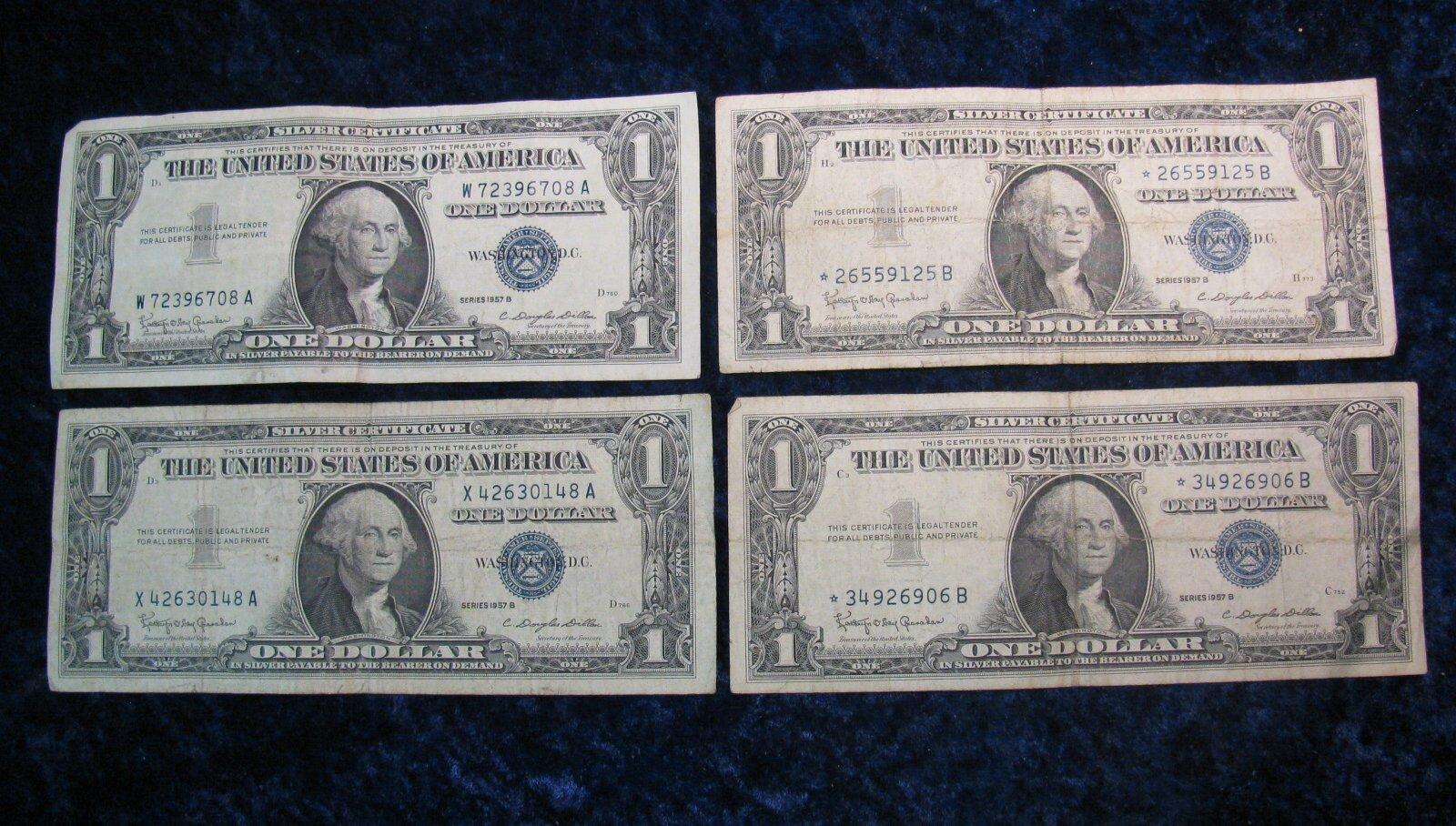 603. (4) Series 1957B $1 Silver Certificates. Two are Star replacement notes. VG-F.