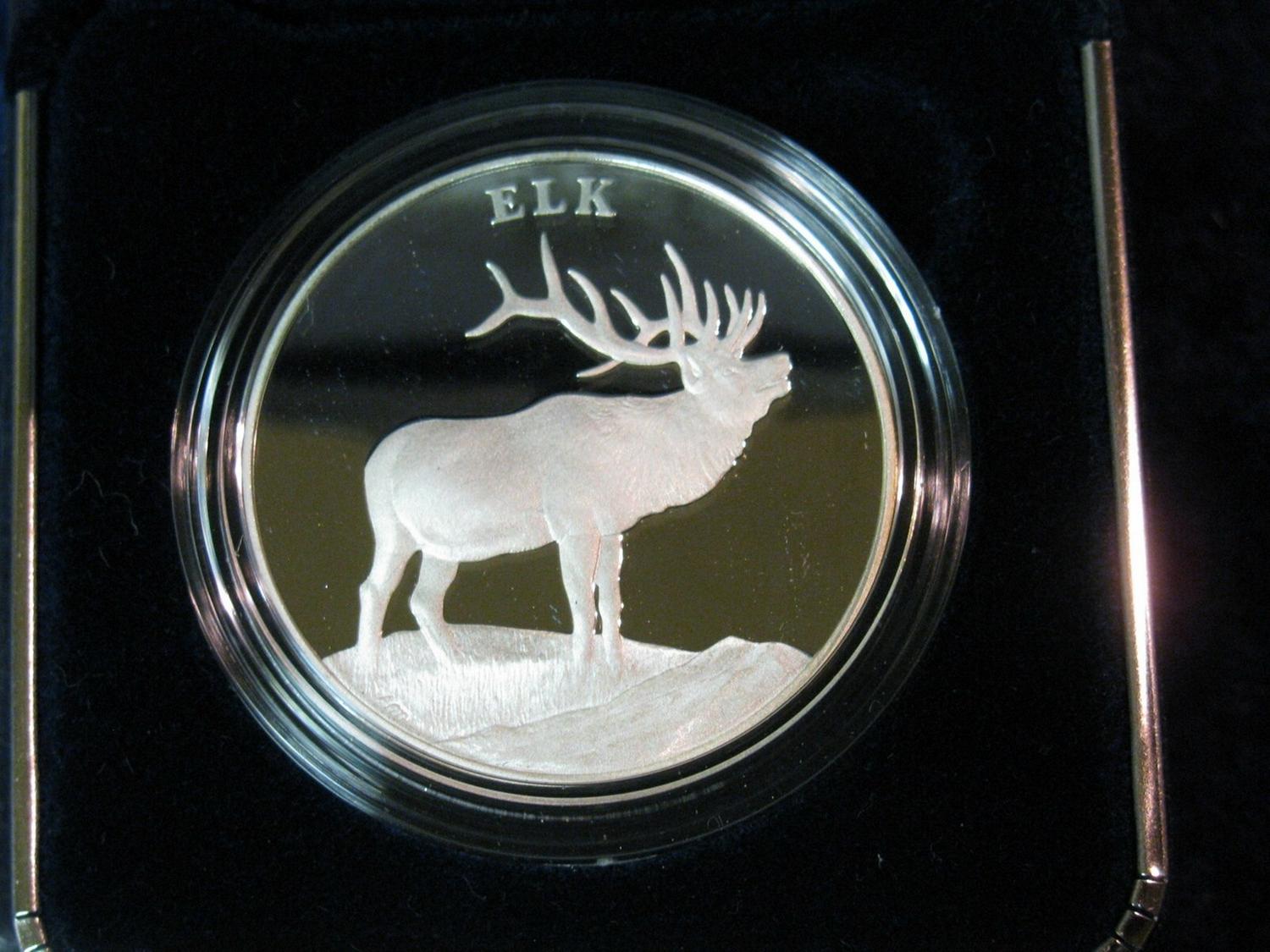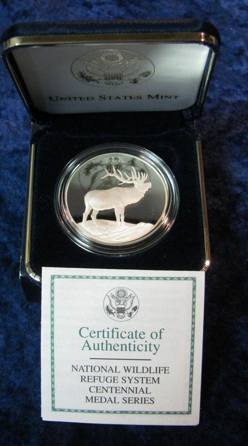 603. 2003 U.S. Mint National Wildlife Refuge System Centennial Medal. "Celebrating a Century of Conservation.1903-2003 Theodore Roosevelt". Depicts Elk. Philadelphia Mint. 26.73 grams. 1.5" diameter. Proof. 90% Silver. With original Certificate of Authenticity.