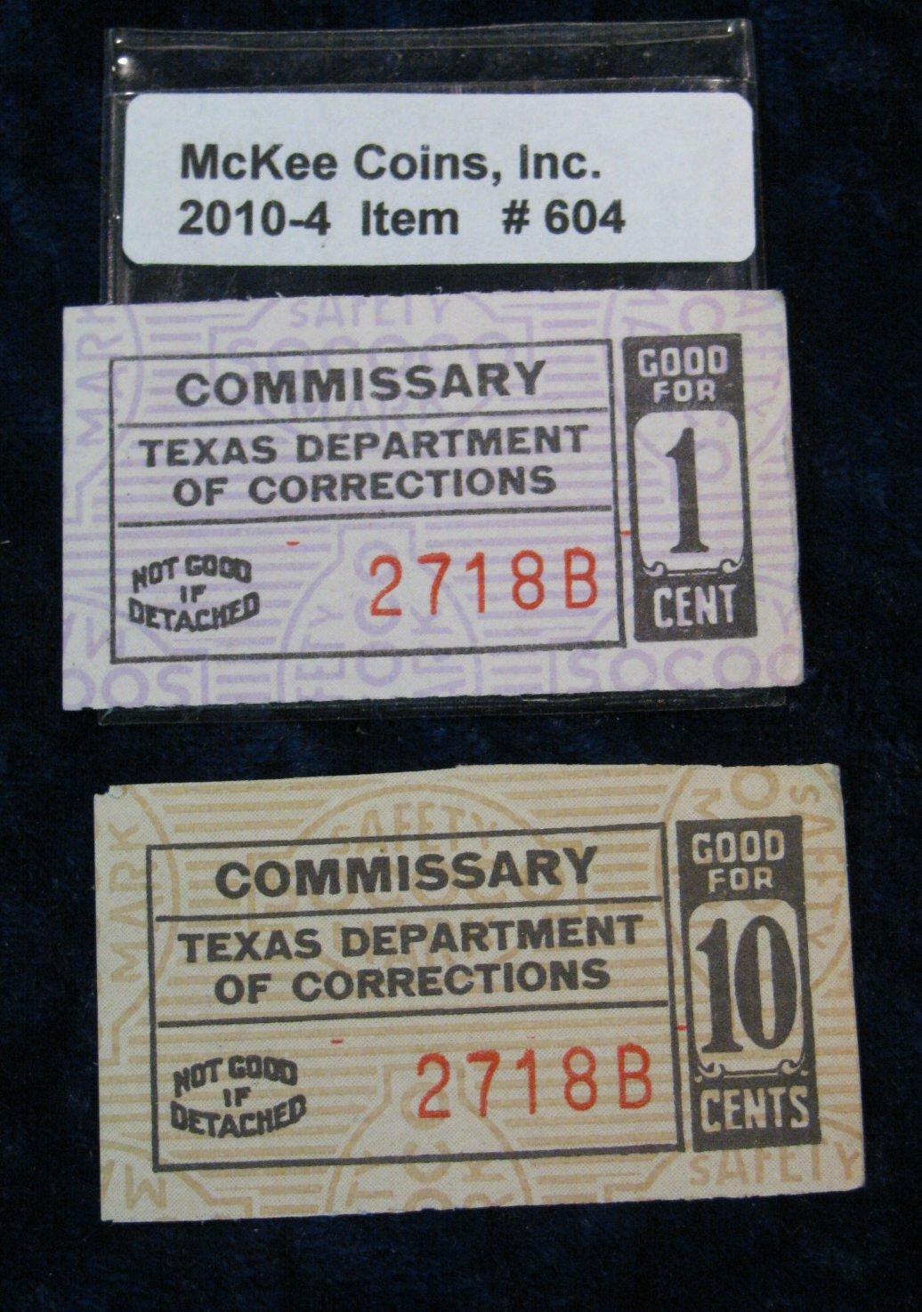 604. 1c & 10c "Commissary Texas Department of Corrections" Scrip.