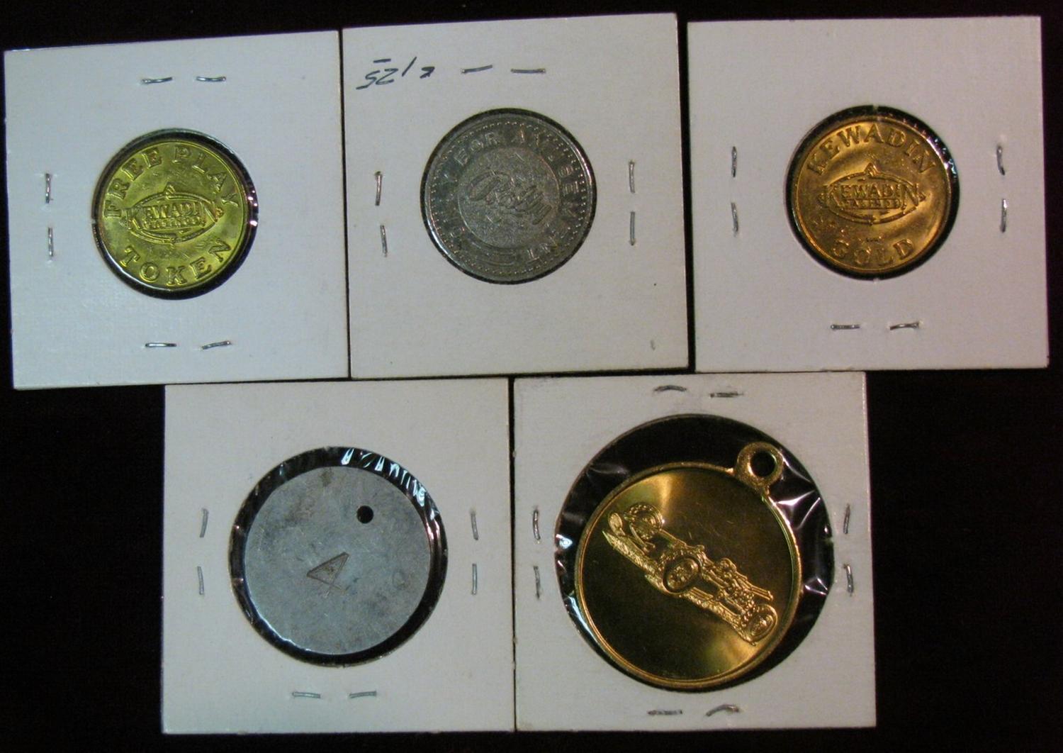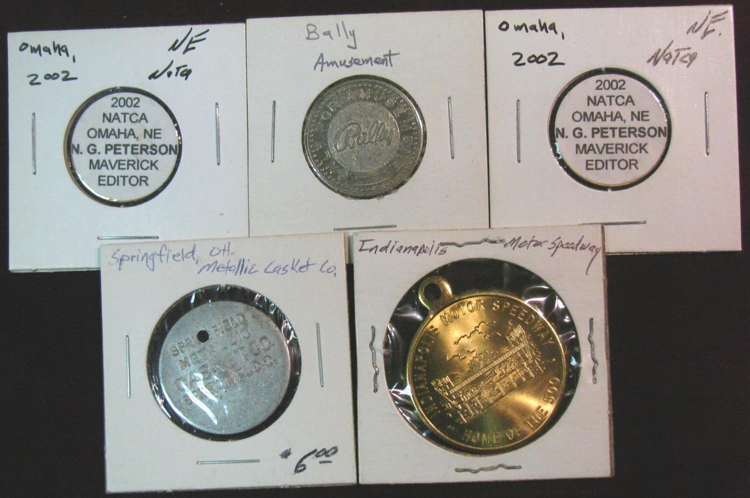 604. Indianapolis Motor Speedway Pendant; Springfield, Ohio Metallic Casket Co. Medal holed; Balley Amusement Token; & (2) 2002 Natca Maverick Editor Tokens.