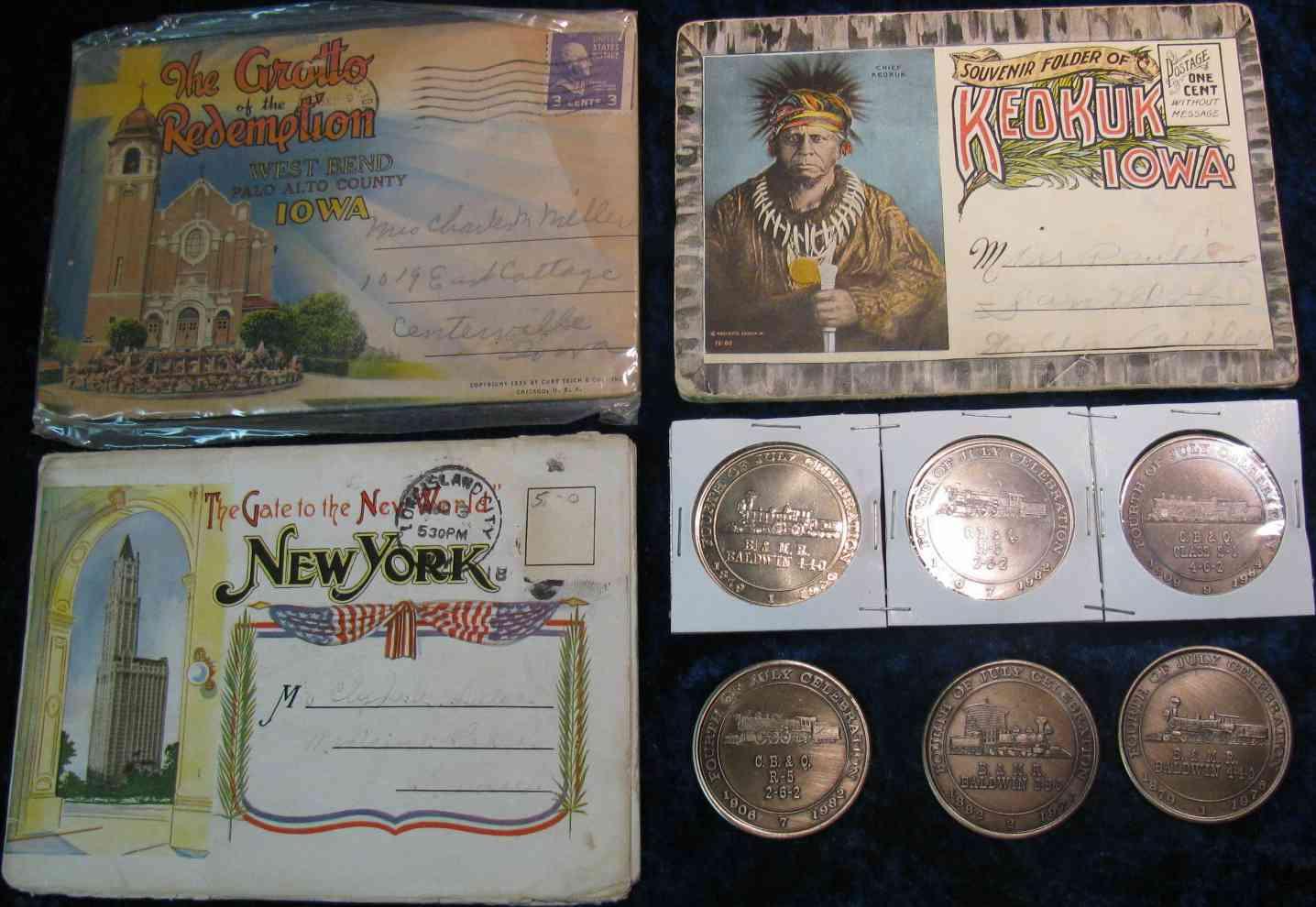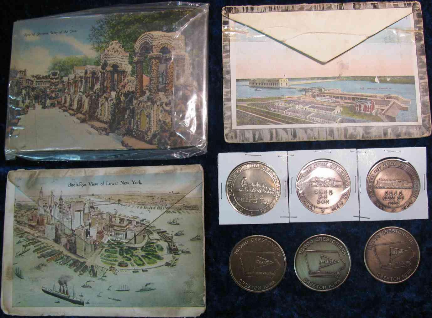 605. Post Card folders from Keokuk Ia., Grotto of Redemption, & New York; & (6) Creston, Ia. Medals.