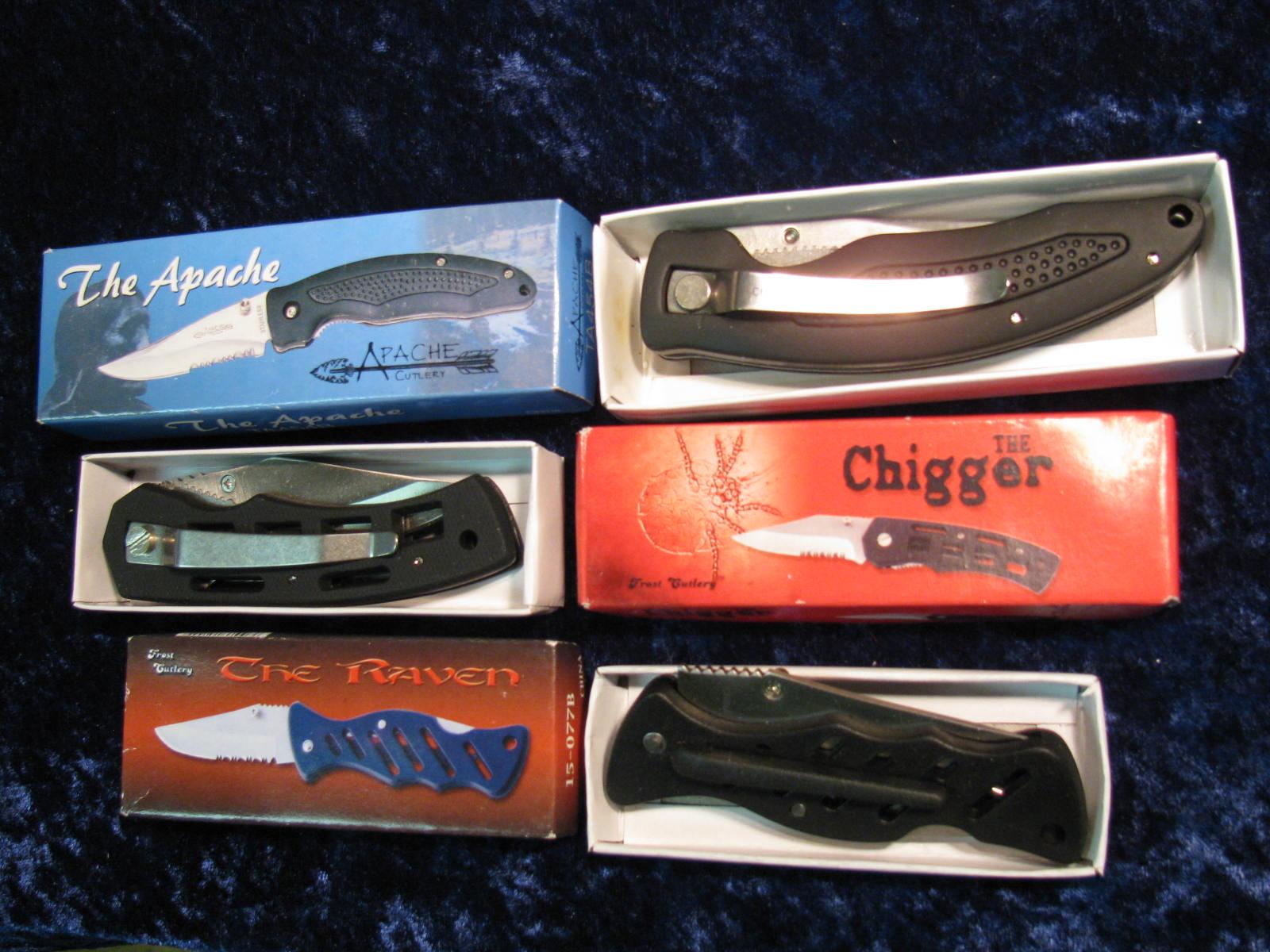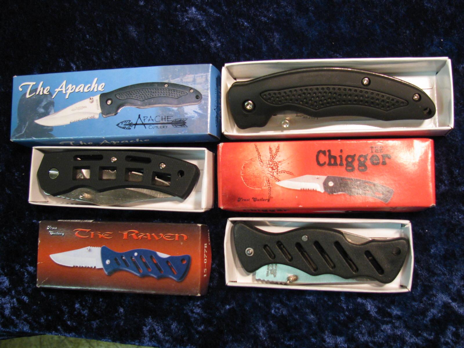 606. (3) Collector's Knives "The Apache" Apache Cutlery; "The Chigger" Frost Cutlery; & "The Raven" Frost Cutlery. All mint condition in boxes.