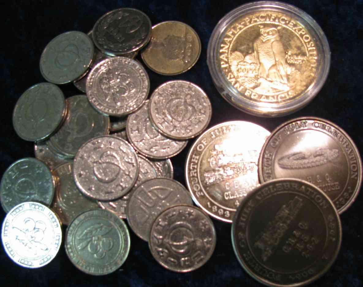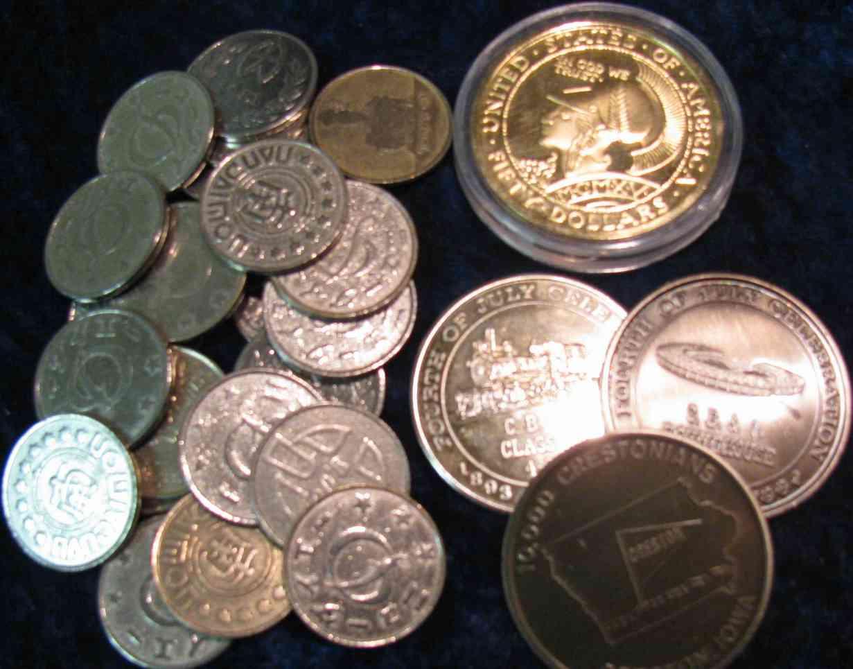 606. (3) Creston Ia. Medals; (25) Gaming Tokens; & copy 1916 $50 Gold Pan-Pac