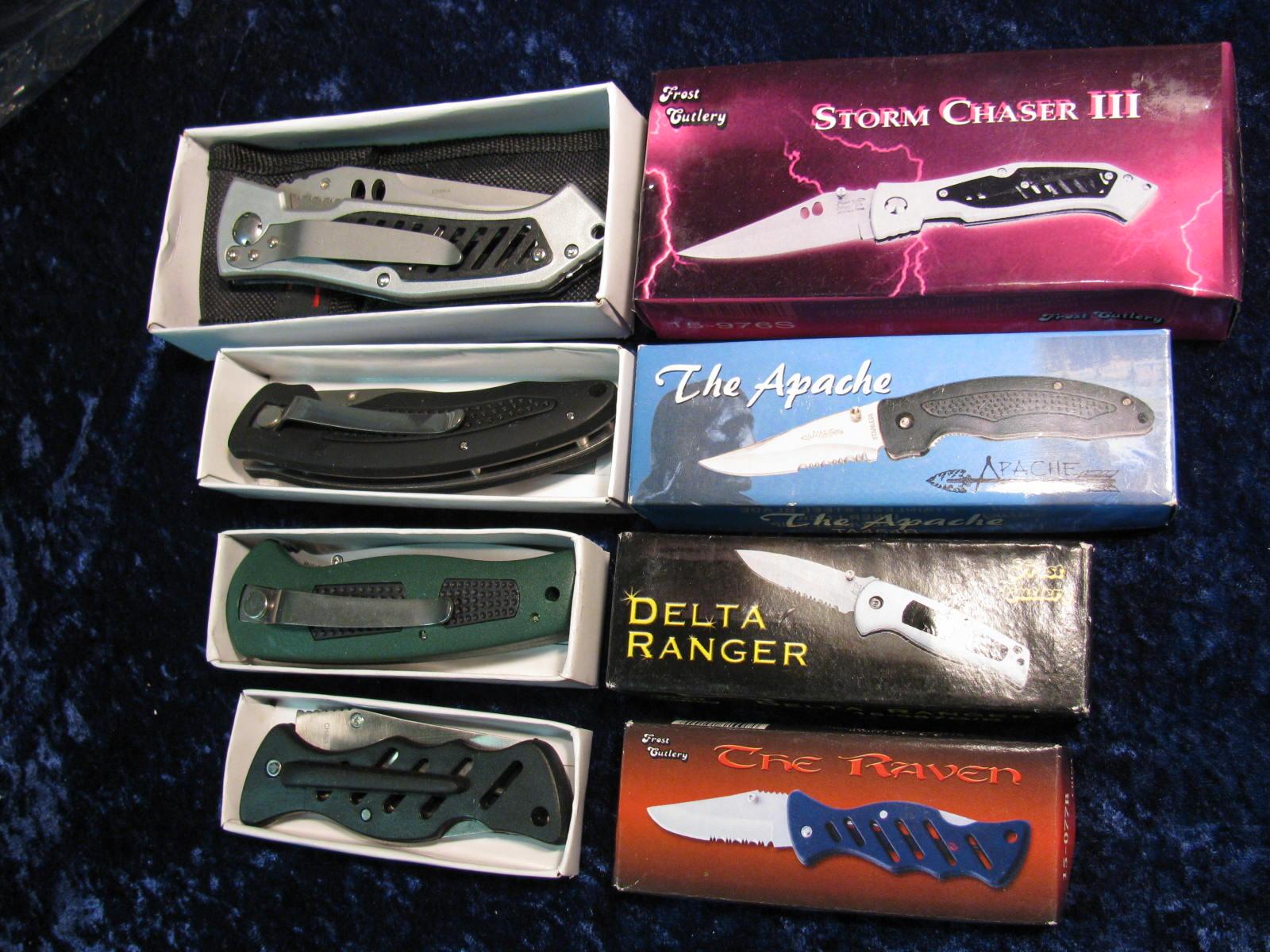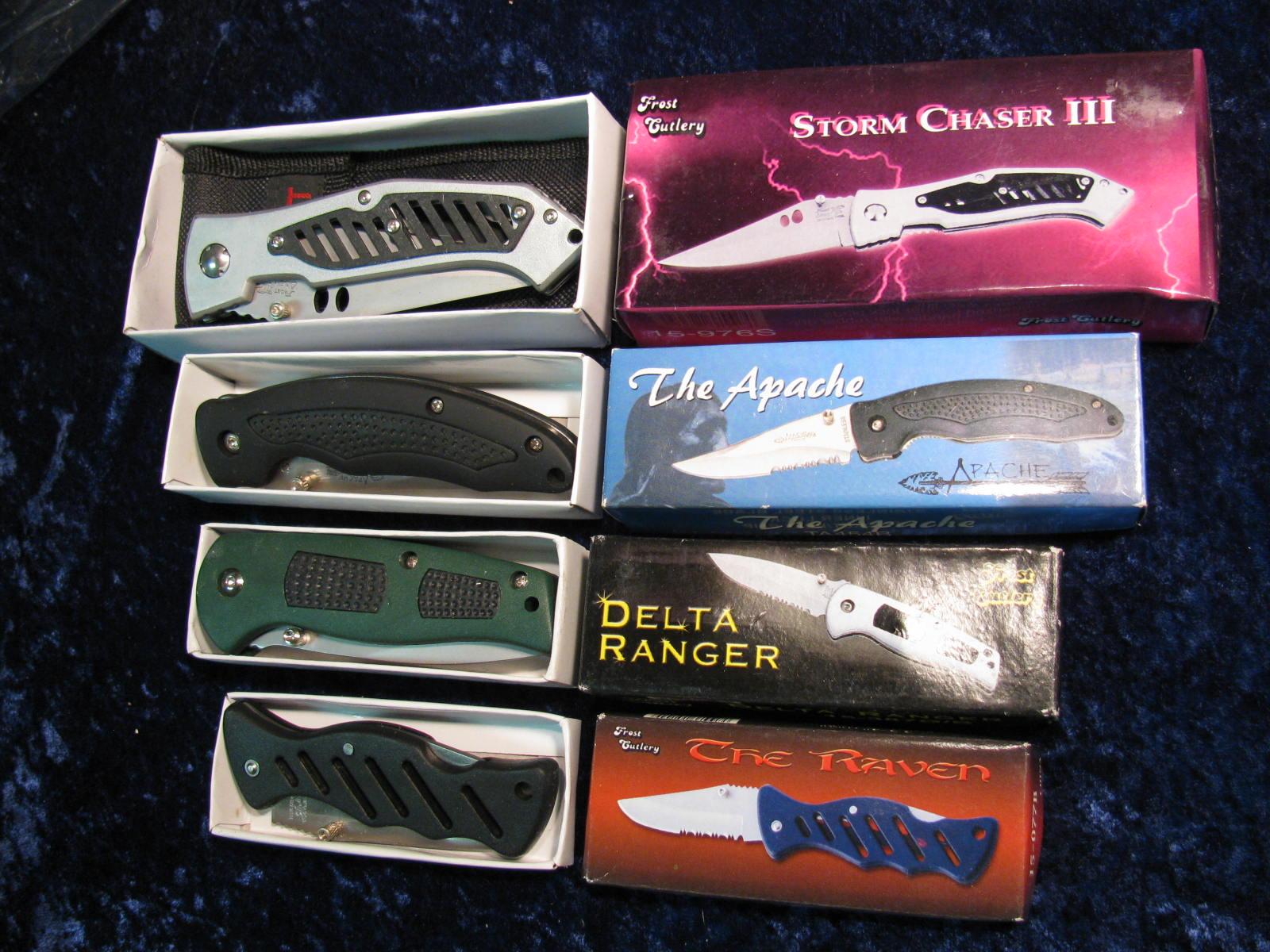 607. (4) Collector's Knives "The Apache" Apache Cutlery; "Delta Ranger" Frost Cutlery; "Storm Chaser III" Frost Cutlery; & "The Raven" Frost Cutlery. All mint condition in original boxes.
