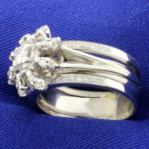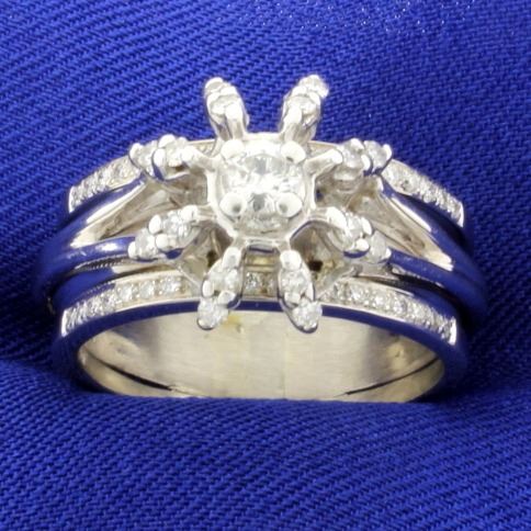 In 14K white gold, the center diamond is a 1/4ct round brilliant diamond - very white G color/I clarity, It is surrounded by sixteen .01ct diamonds of similar quality. Also there are thirty eight 1/2pt diamonds on the shank. Size 9 1/2 10.7g