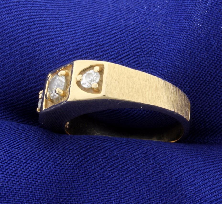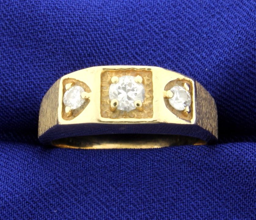 The ring is 14K yellow gold and contains one .33ct and two .14ct diamonds, all SI clarity/H color. Size 10 9.3g