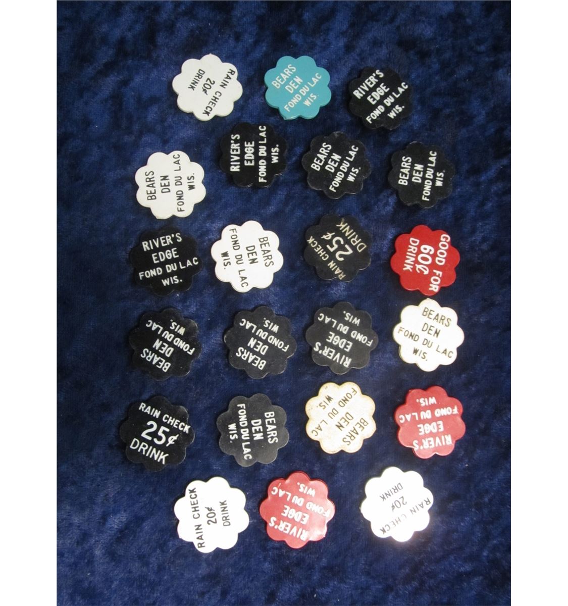 61. Group of Plastic Scalloped edge Tokens from "Bears Den Fond Du Lac Wis." Various denominations. (22 pcs.)