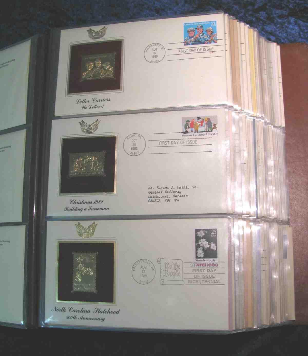 61. Large Simulated Leather Bound Album titled "Golden Replicas of U.S. Stamps" Proof replicas on a gleaming surface of 22K gold. Features 78 different covers which, originally sold for $7.25 each. Total value $565.50