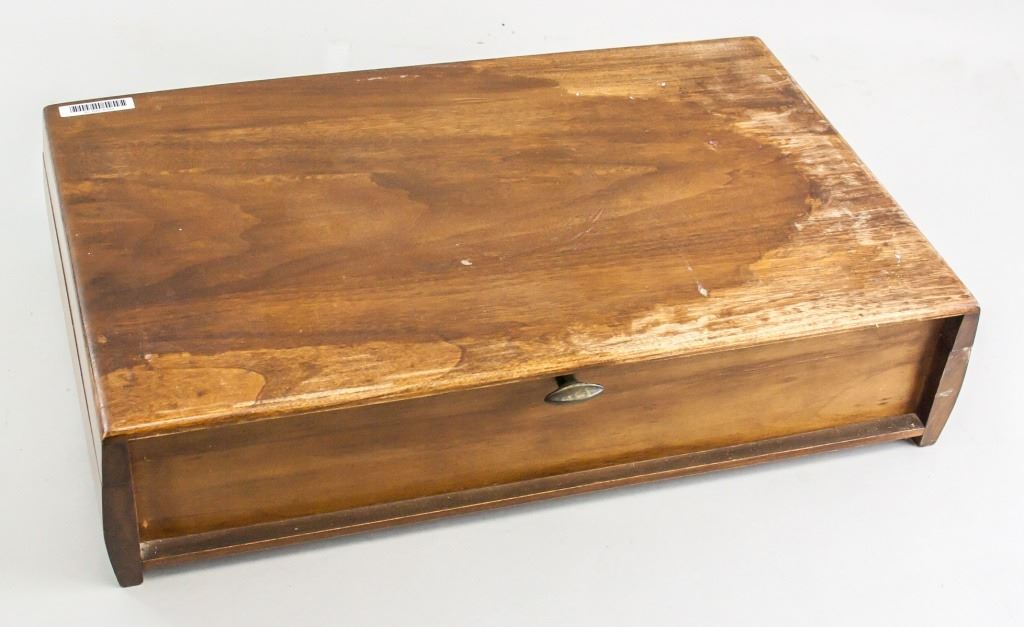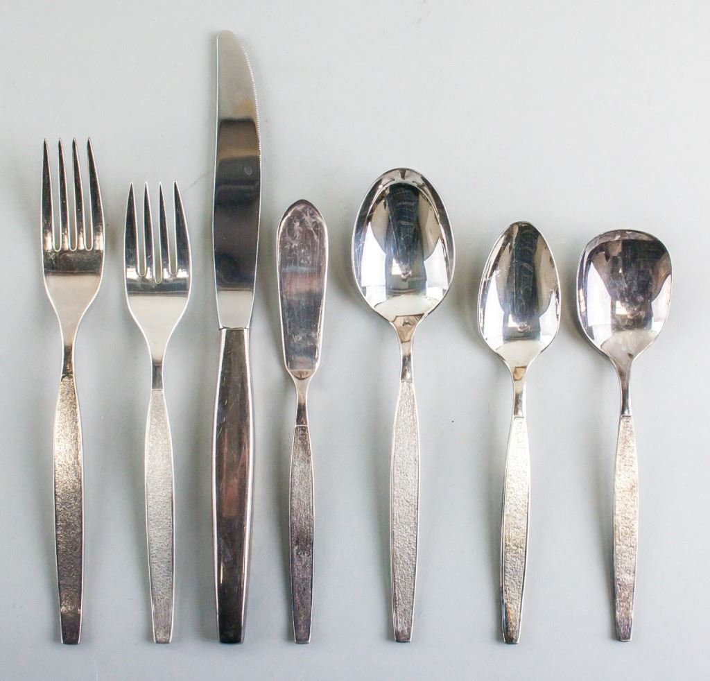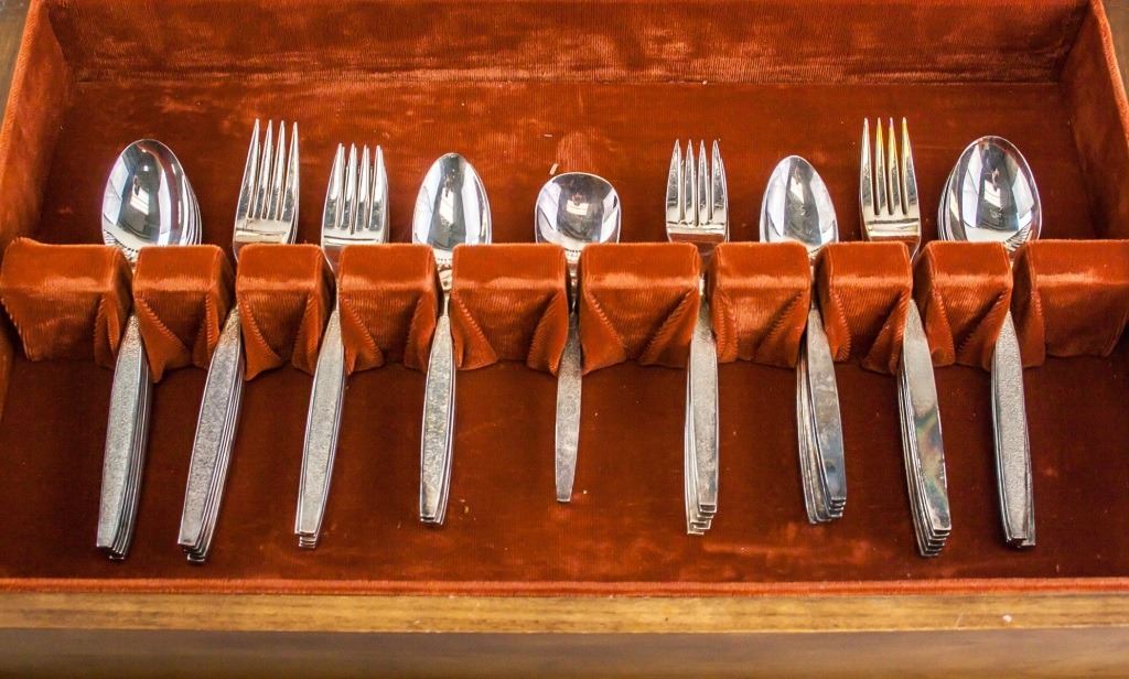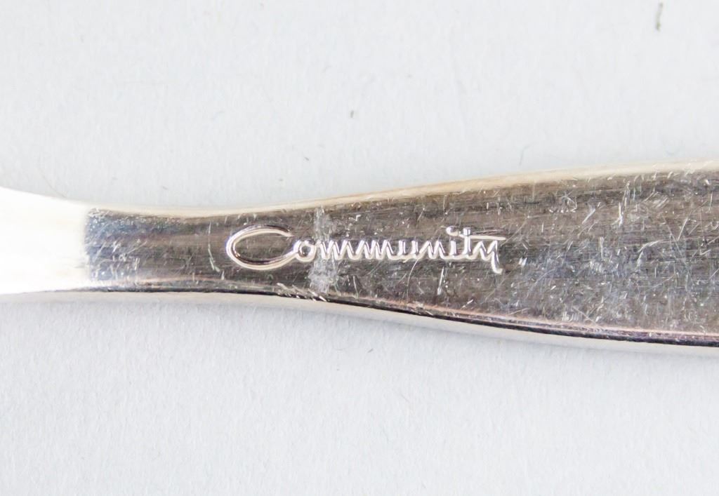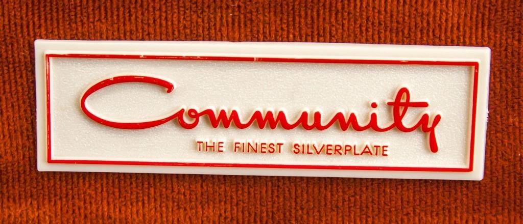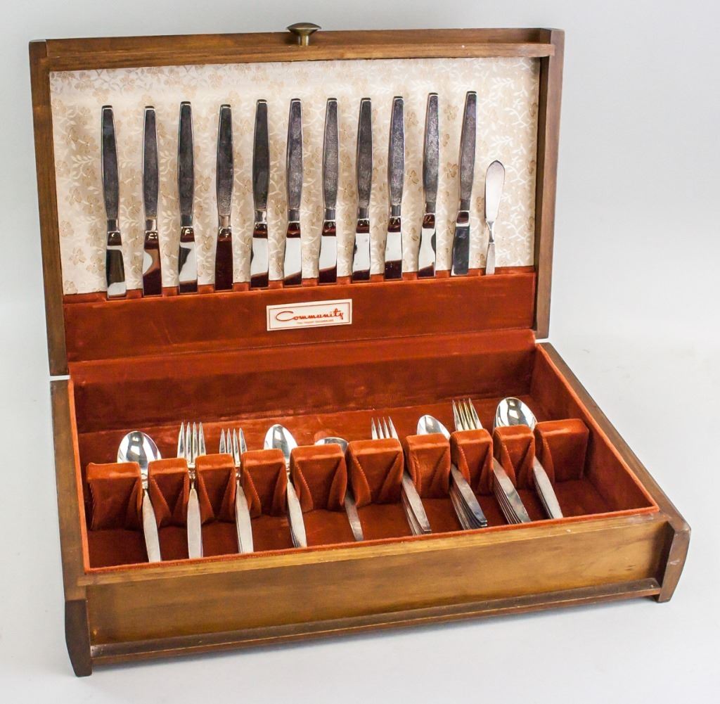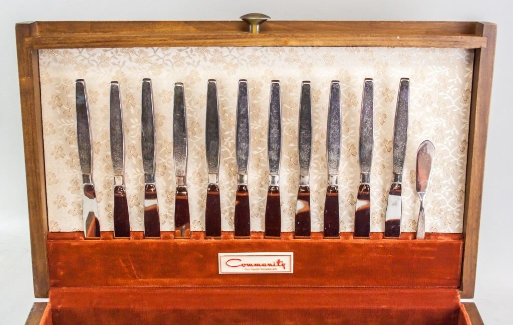 61-piece silverware set, with wooden storage box. "Community The Finest Silverplate" label on inside. "Community" stamped on silverware. 11 x 48 x 30 cm. 5 kg. Silver content has not been tested for purity.