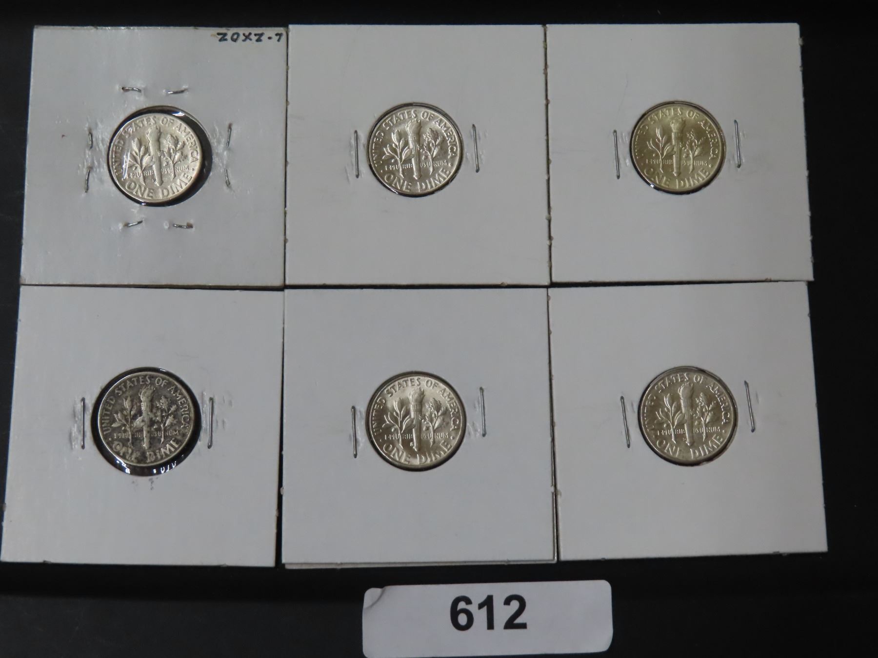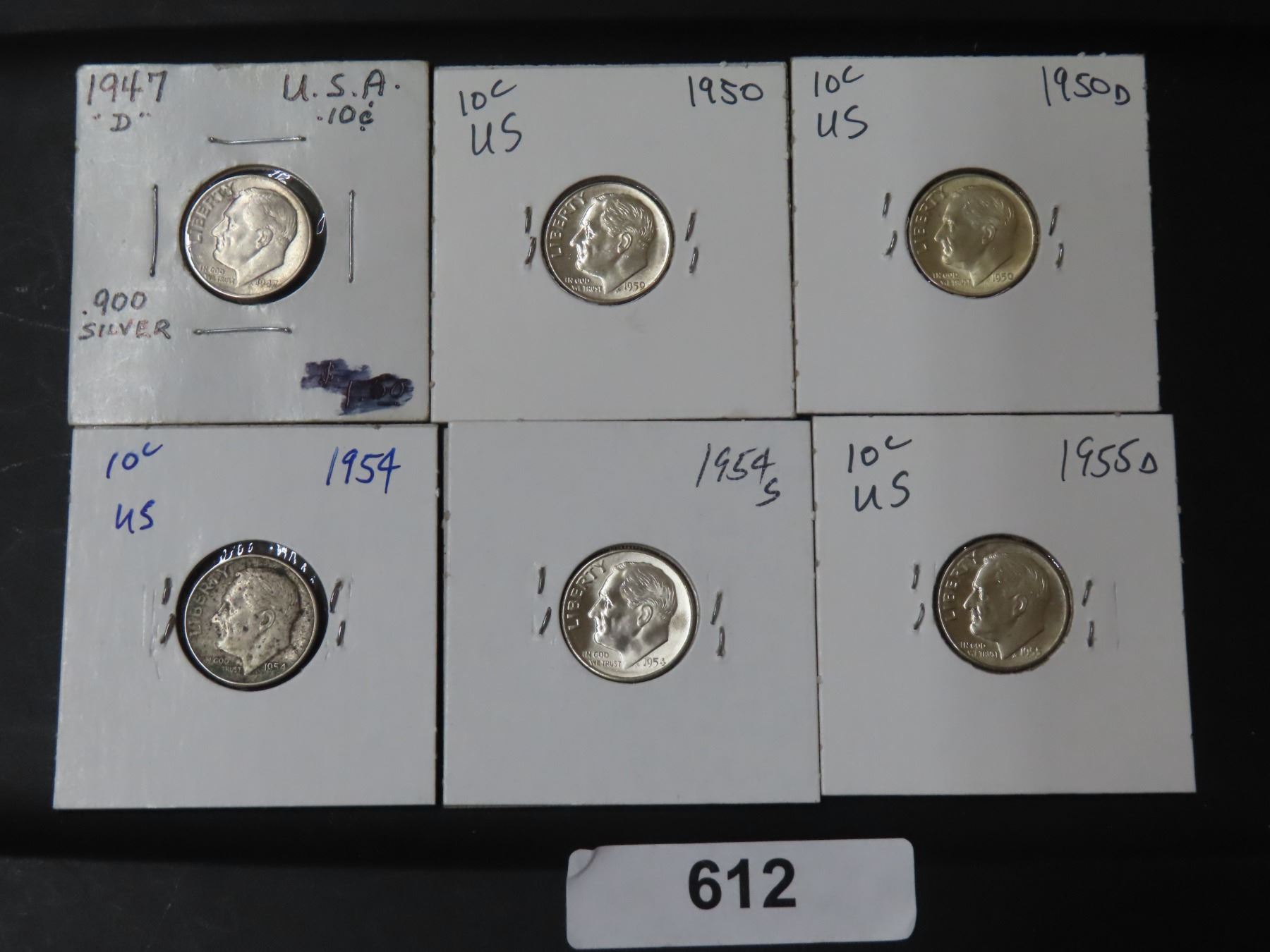 612 6 US 90% SILVER DIMES 1947D,50,50D,54,54S,55D 47D&54 XF, REST UNC