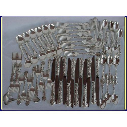 61pc Gorham sterling silver cutlery / flatware service for 12 in the Strasbourg pattern. Made in the USA. Introduced in 1897, is one of Gorham's finest