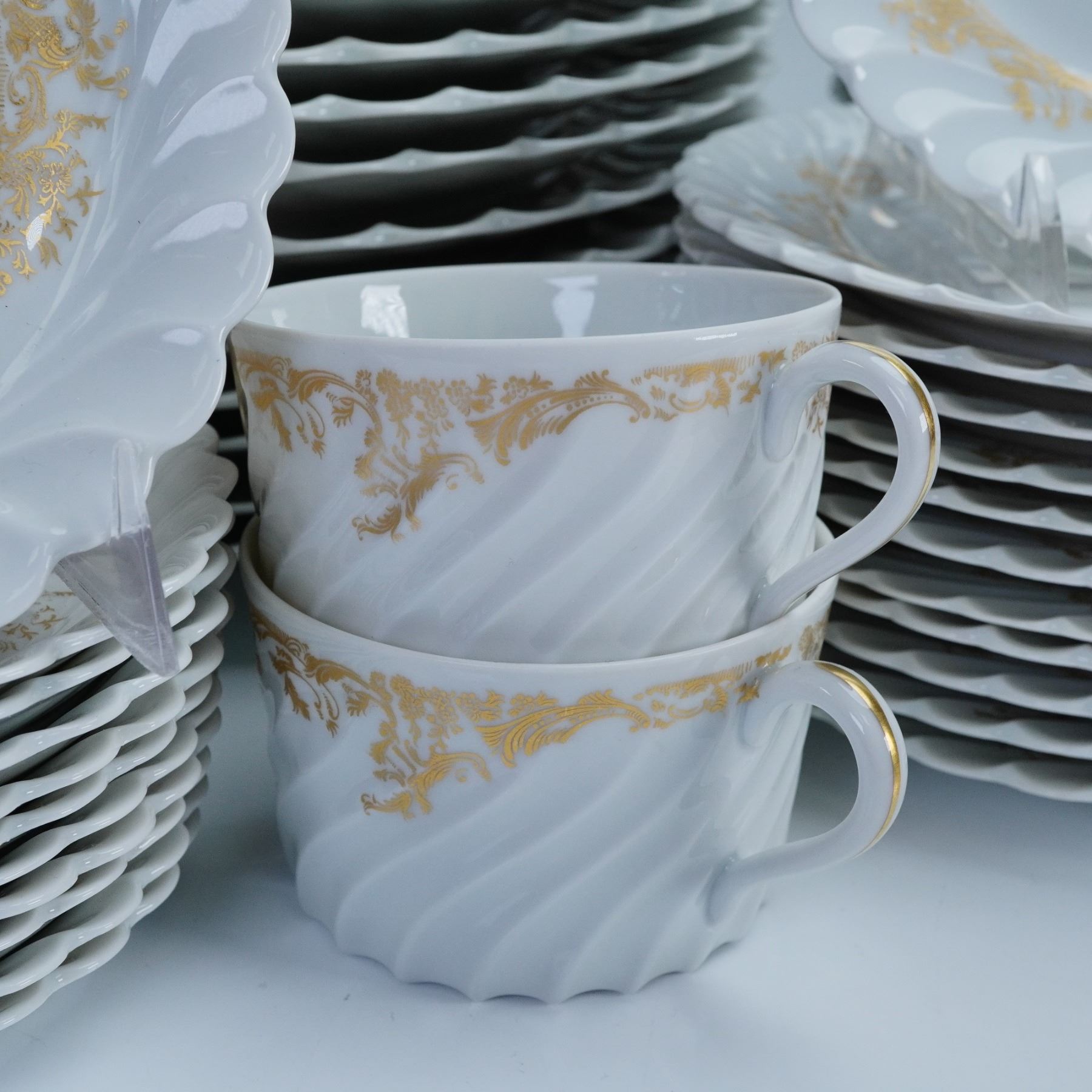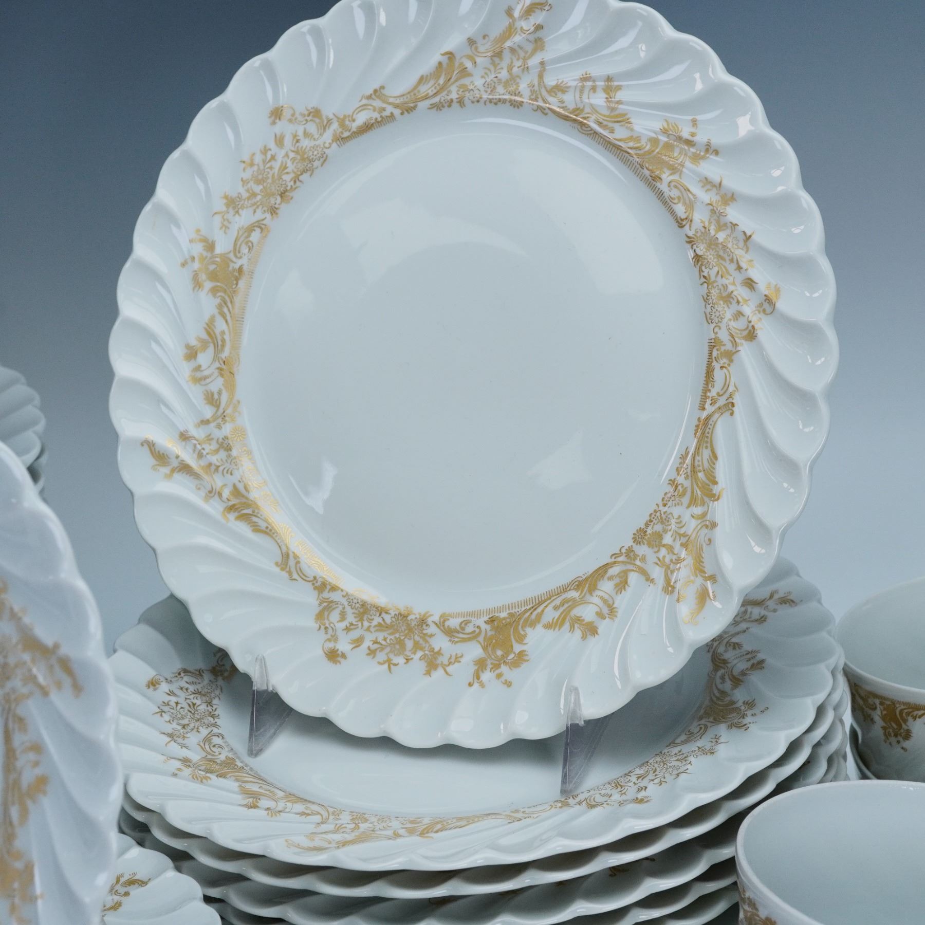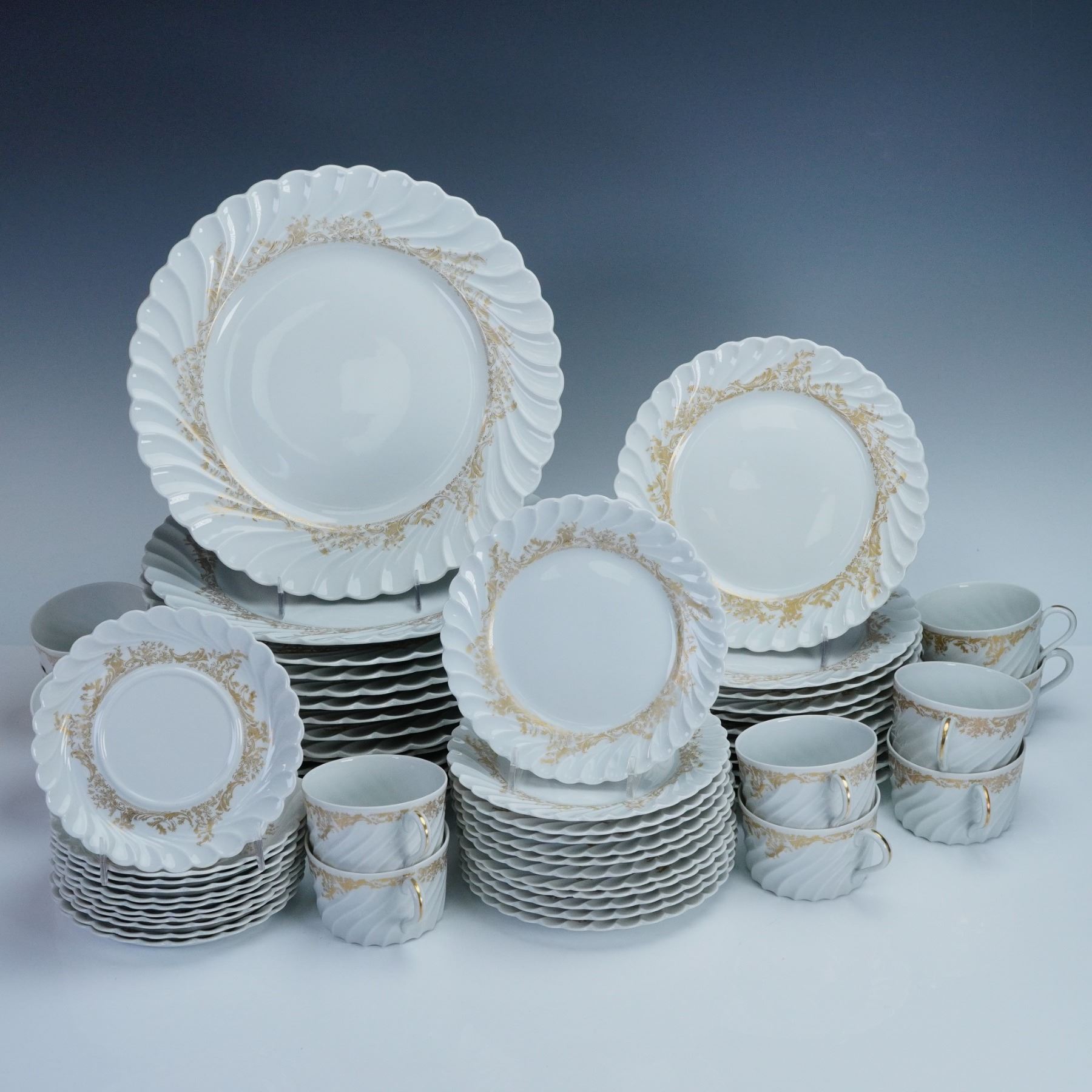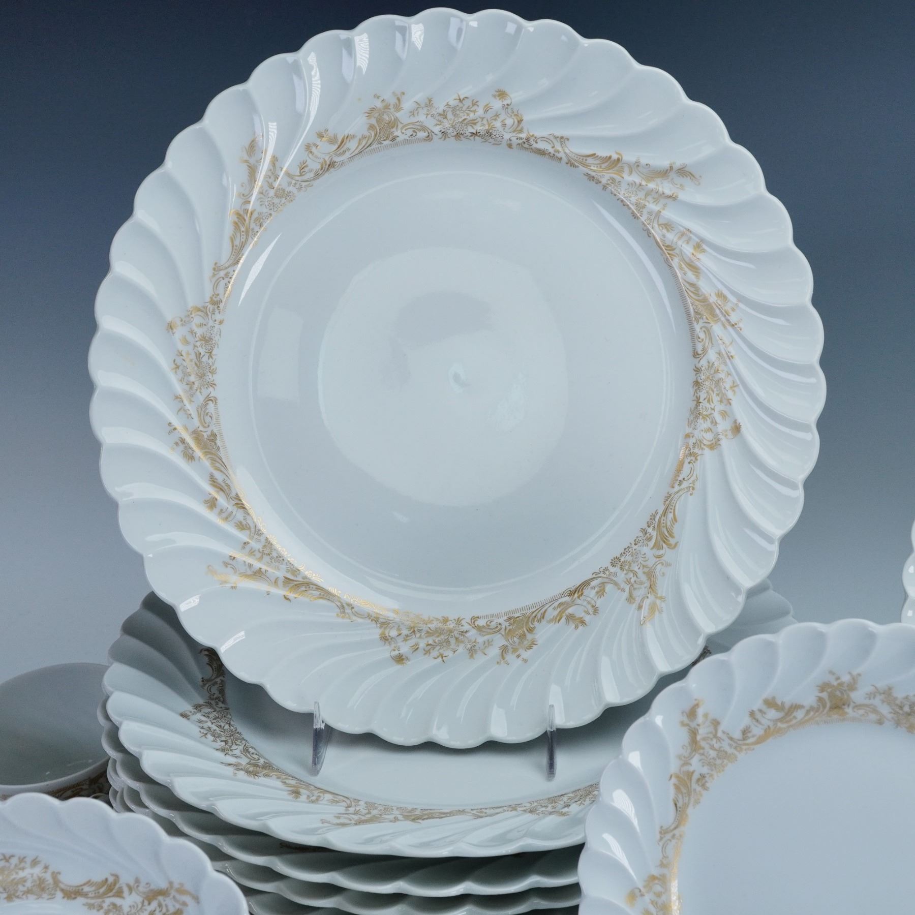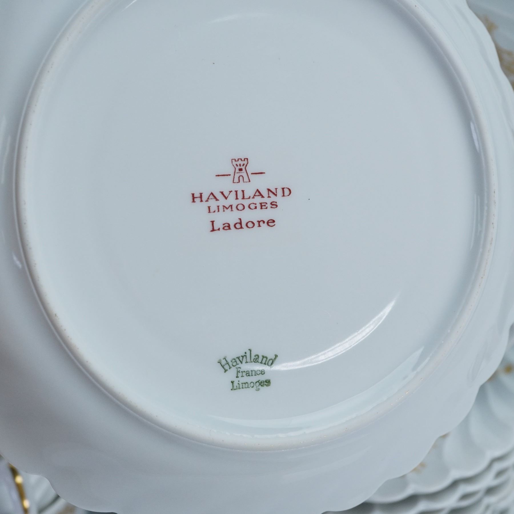 Elegant French porcelain dinnerware set by Haviland Limoges in the Ladore pattern. Each piece features a swirling rim design embellished with gilt foliate accents on white ground. Marked "Haviland Limoges Ladore" and "Haviland France Limoges" to the undersides. Includes 12 flat cups, 11 saucers, 12 bread and butter plates, 12 salad plates, and 14 dinner plates.