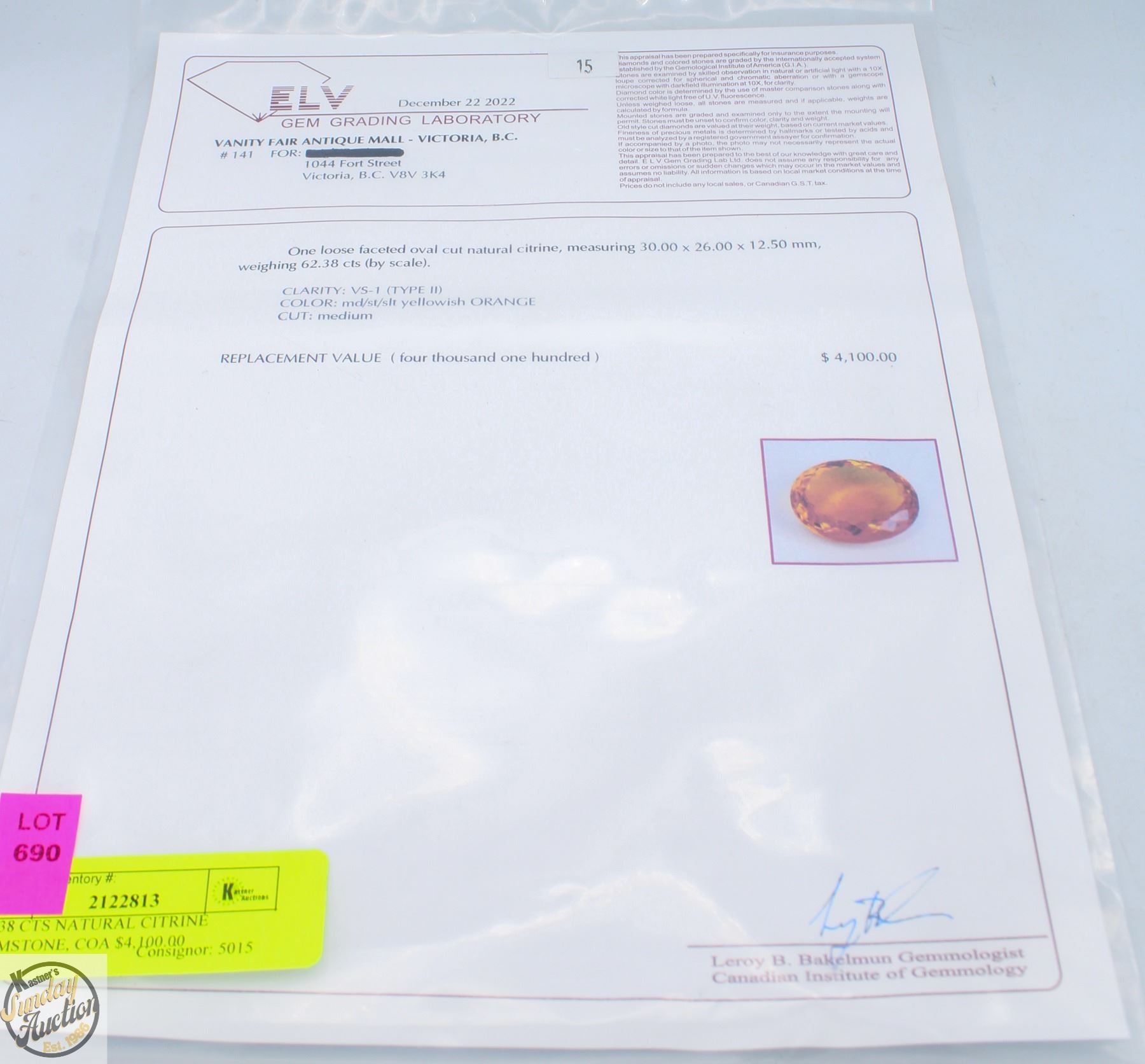62.38 CTS NATURAL CITRINE GEMSTONE, COA $4,100.00