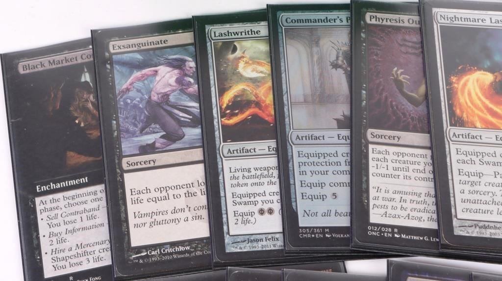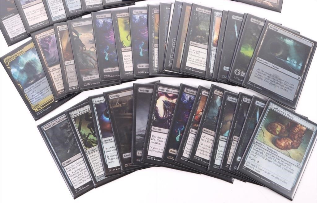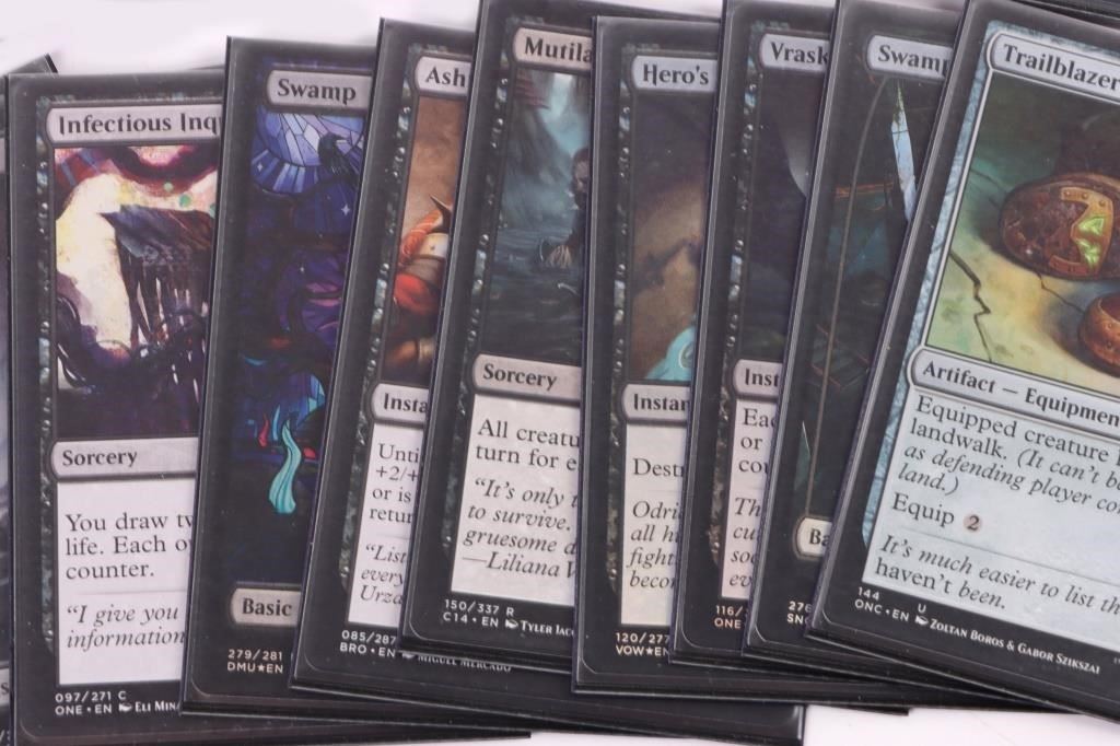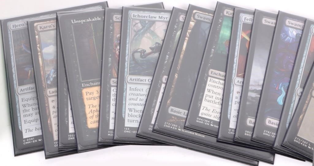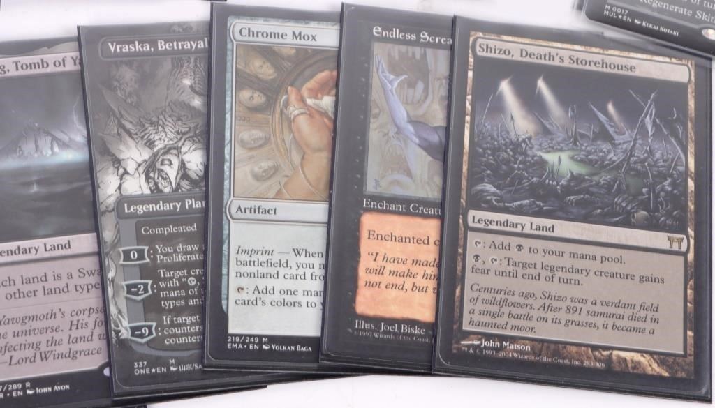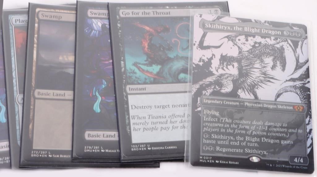 63 Magic the Gathering cards with various foils and mythic cards such as Cavern of Souls, Chrome Mox, and Original Foil Scars of Mirrodin Skithiryx.