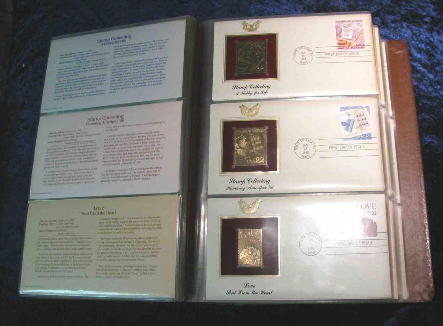 62. Large Simulated Leather Bound Album titled "Golden Replicas of U.S. Stamps" Proof replicas on a gleaming surface of 22K gold. Features 75 different covers which, originally sold for $7.25 each. Total value $543.75.