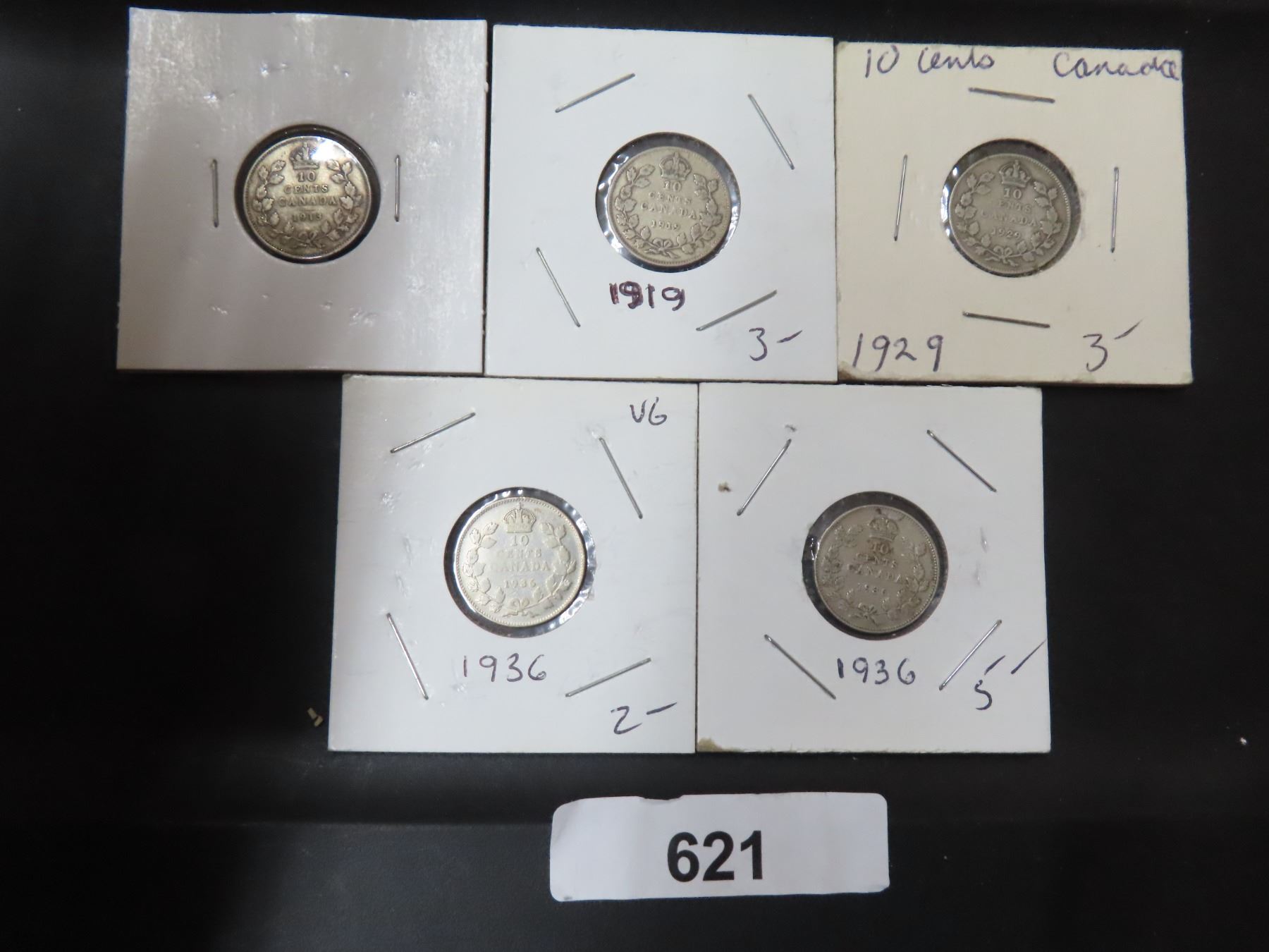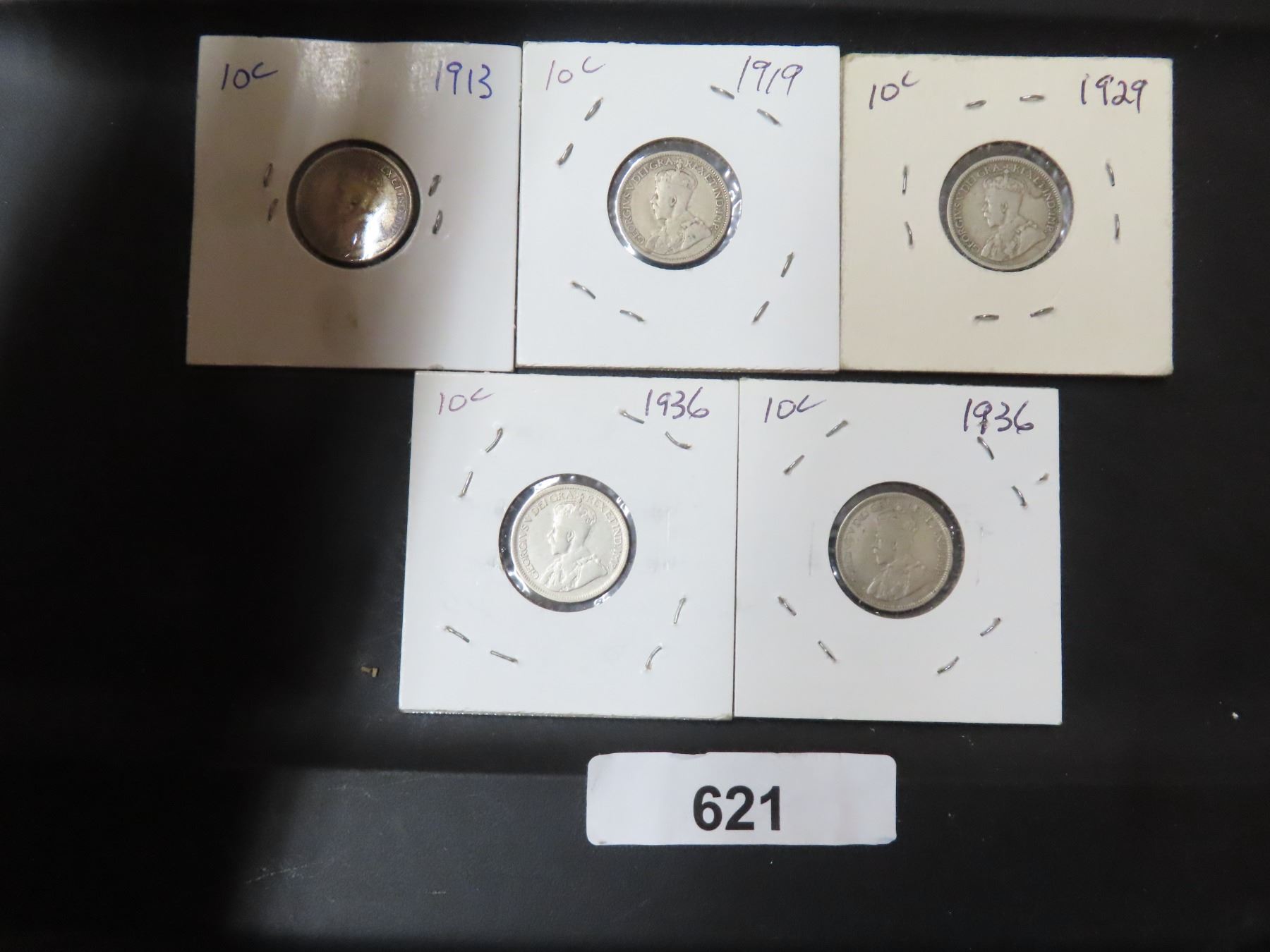 621 5 CDN SILVER DIMES 1913,19,29,2-36 VG-F
