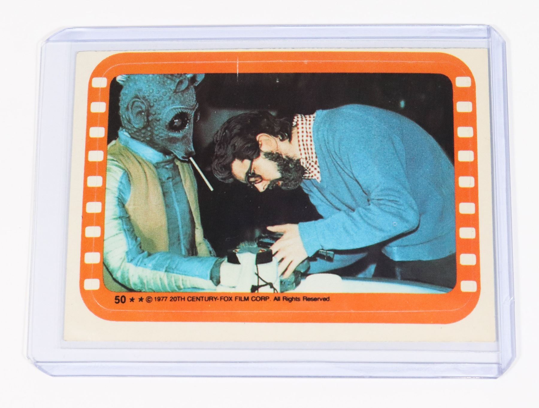 DIRECTOR GEORGE LUCAS AND GREEDO READY TO GRADE! TOPPS STICKER CARD STAR WARS A NEW HOPE 1977 INCLUDES CARD PROTECTIVE SLEEVE