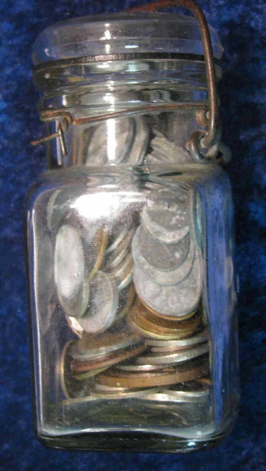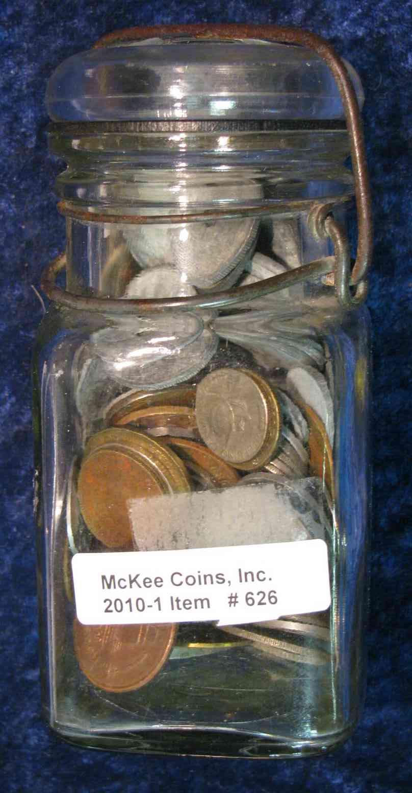 626. Fruit Jar with Glass lid full of coins & tokens. Includes some Nazi Germany.