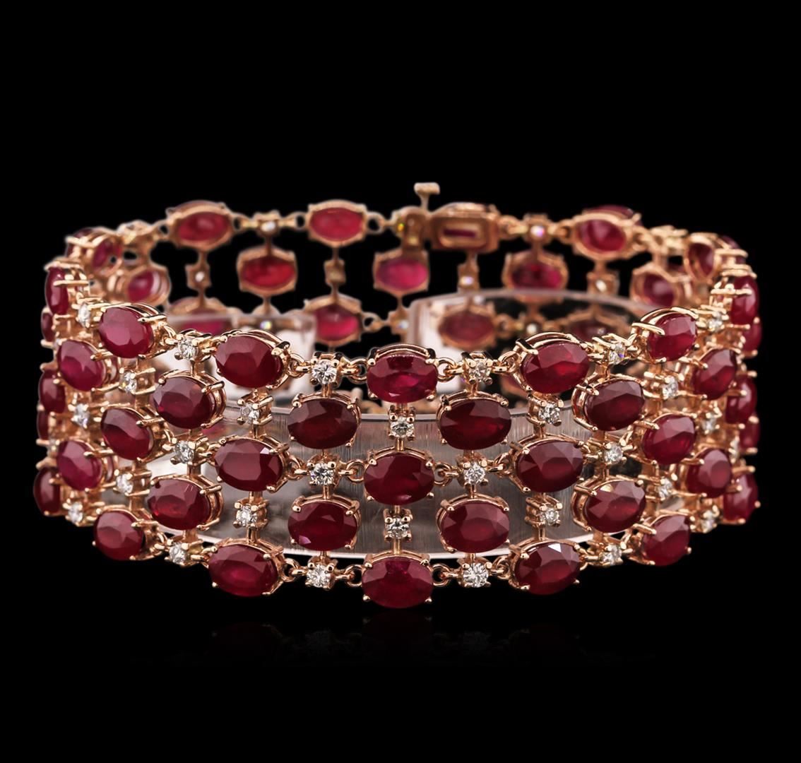 One electronically tested 14KT rose gold ladies cast ruby and diamond bracelet with a hidden box clasp with a bright polish finish. 7.50" in length Condition is new. Containing: Sixty-five prong set oval modified brilliant cut natural rubies, measuring 7.00 x 5.00 x 3.25mm, approximate total weight of 63.05ct., clarity is heavily included, type II, medium dark, slightly brownish, strongly purplish red color, (GIA stpR 6/2), cut is good. Sixty-Five prong set round brilliant cut diamonds, measuring 2.20 - 2.20 x 1.32mm (depth est.) approximate total weight of 65 Stones = 2.53ct. Clarity: SI-1 to SI-2. Color: H - I, Cut is Good. Colored gemstones are presumed to have been subjected to commonly used enhancement processes. All diamonds and colored gemstones are graded in the mounting, unless otherwise stated. Total Weight of Colored Stones 63.05ct. Total Weight of Diamonds 2.53ct. Total Weight of Bracelet 51.00 grams. GGL Appraised at $14,805.00.
