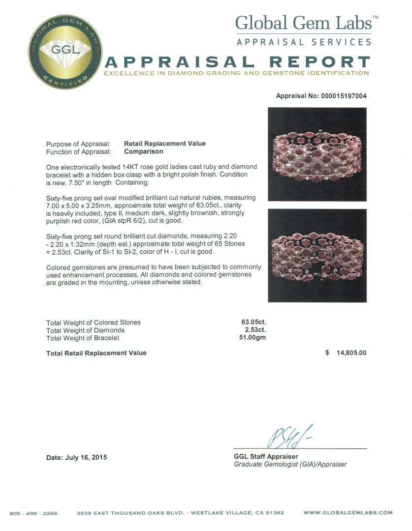 One electronically tested 14KT rose gold ladies cast ruby and diamond bracelet with a hidden box clasp with a bright polish finish. 7.50" in length Condition is new. Containing: Sixty-five prong set oval modified brilliant cut natural rubies, measuring 7.00 x 5.00 x 3.25mm, approximate total weight of 63.05ct., clarity is heavily included, type II, medium dark, slightly brownish, strongly purplish red color, (GIA stpR 6/2), cut is good. Sixty-Five prong set round brilliant cut diamonds, measuring 2.20 - 2.20 x 1.32mm (depth est.) approximate total weight of 65 Stones = 2.53ct. Clarity: SI-1 to SI-2. Color: H - I, Cut is Good. Colored gemstones are presumed to have been subjected to commonly used enhancement processes. All diamonds and colored gemstones are graded in the mounting, unless otherwise stated. Total Weight of Colored Stones 63.05ct. Total Weight of Diamonds 2.53ct. Total Weight of Bracelet 51.00 grams. GGL Appraised at $14,805.00.