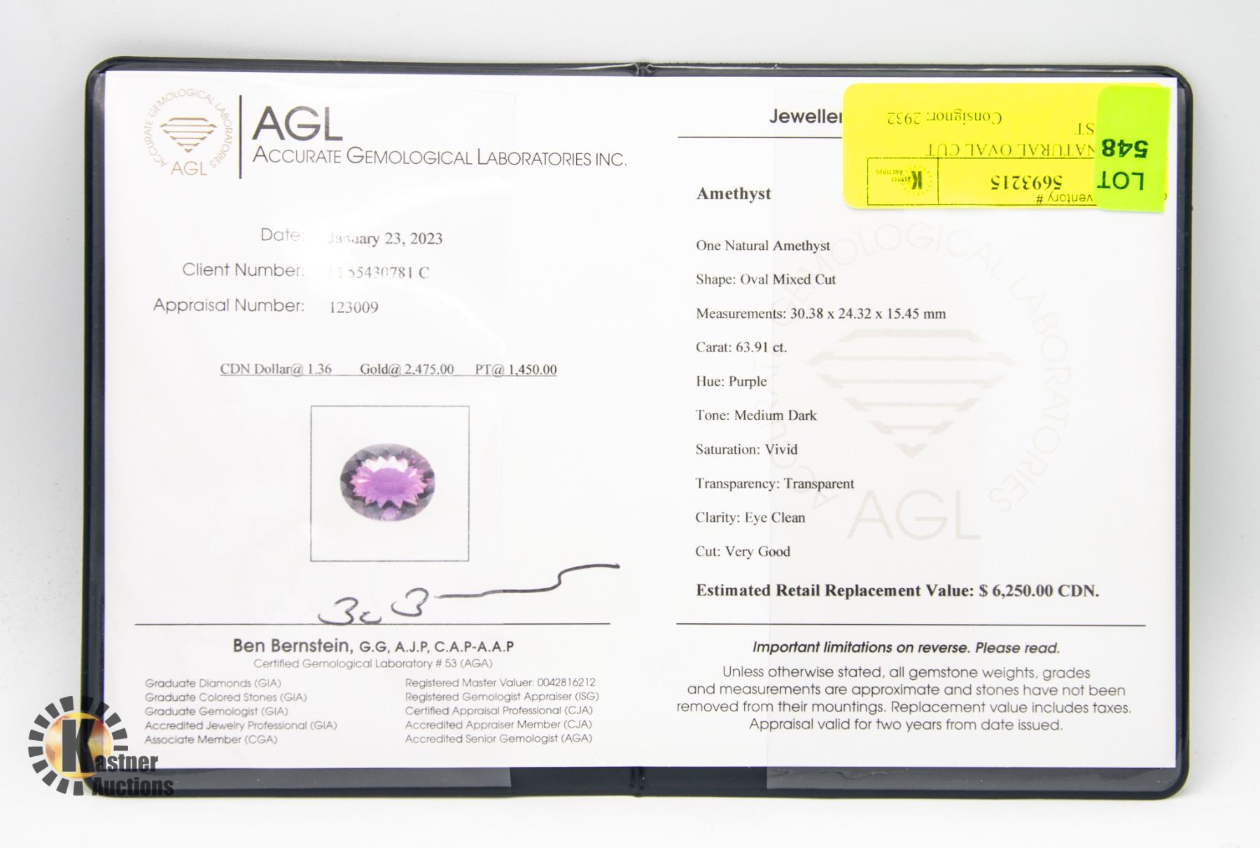 OVAL MIXED CUT GEMSTONE MEASURING 30.38 X 24.32 X 15.45MM, HUE IS PURPLE, TONE IS MEDIUM DARK. SATURATION IS VIVID, TRANSPARENT STONE WITH EYE CLEAN CLARITY. CUT IS VERY GOOD. COMES WITH APPRAISAL FROM AGL (123009) APPRAISED VALUE $6,250.00 **ALL ITEMS MUST BE REMOVED BY 5PM SATURDAY, SEPTHEMBER 16TH 2023. ALL REMAINING ITEMS WILL BE SUBJECT TO A $6.00 PER DAY STORAGE CHARGE. ANY ITEMS REMAINING AFTER MONDAY, OCTOBER 2ND, 2023 WILL BE CONSIDERED FORFEITED. NO REFUNDS WILL BE ISSUED FOR FORFEITED ITEMS. TO SCHEDULE A PICK UP APPOINTMENT CLICK HERE