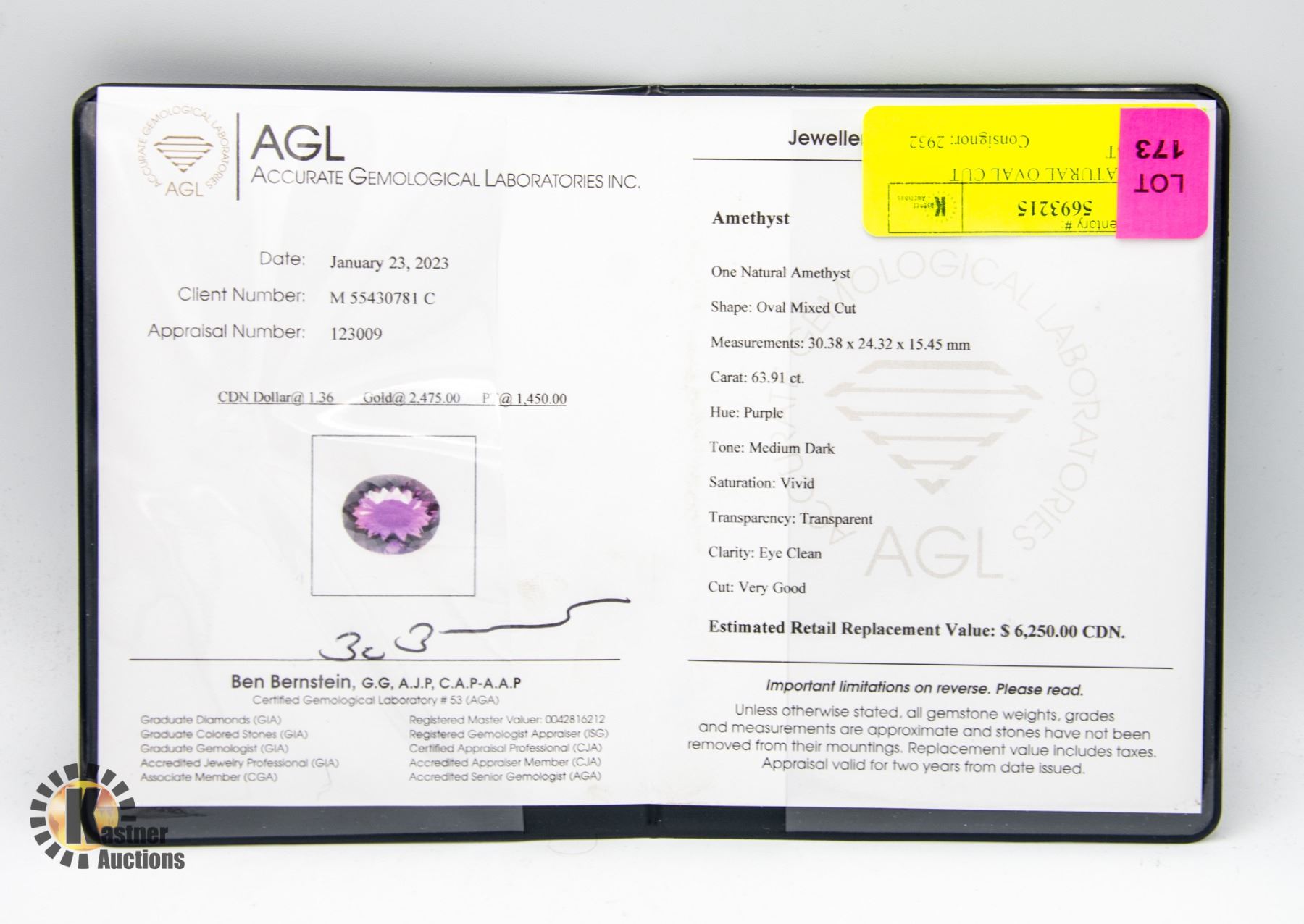 OVAL MIXED CUT GEMSTONE MEASURING 30.38 X 24.32 X 15.45MM, HUE IS PURPLE, TONE IS MEDIUM DARK. SATURATION IS VIVID, TRANSPARENT STONE WITH EYE CLEAN CLARITY. CUT IS VERY GOOD. COMES WITH APPRAISAL FROM AGL (123009) APPRAISED VALUE $6,250.00 **ALL ITEMS MUST BE REMOVED BY 5PM SATURDAY, OCTOBER 7TH 2023. ALL REMAINING ITEMS WILL BE SUBJECT TO A $6.00 PER DAY STORAGE CHARGE. ANY ITEMS REMAINING AFTER MONDAY, OCTOBER 23RD, 2023 WILL BE CONSIDERED FORFEITED. NO REFUNDS WILL BE ISSUED FOR FORFEITED ITEMS. TO SCHEDULE A PICK UP APPOINTMENT CLICK HERE