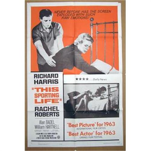 This is an original one sheet poster from the 1963 film about the sport of rugby in Northern Ireland, THIS SPORTING LIFE, starring Richard Harris and Rachel Roberts. Measures 27" x 41". Condition: pinholes; tears along upper corner.