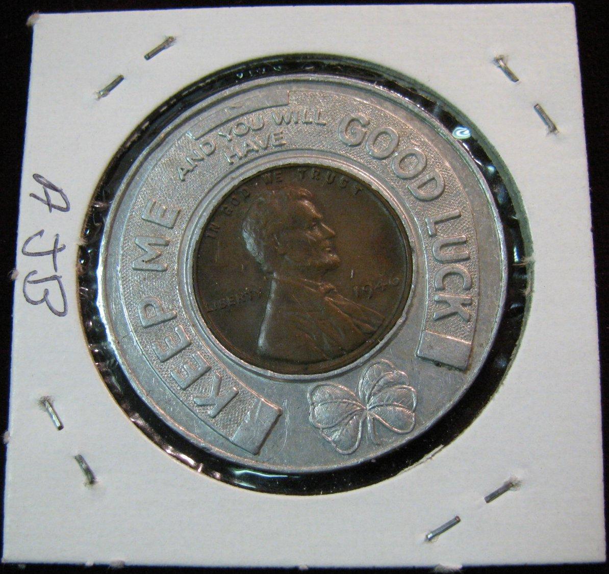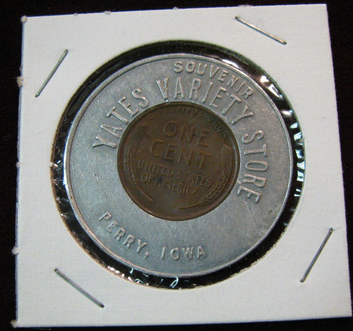 635. Encased Cent. "Souvenir Yate's Variety Store/Perry, Iowa". 1946 Lincoln Cent.