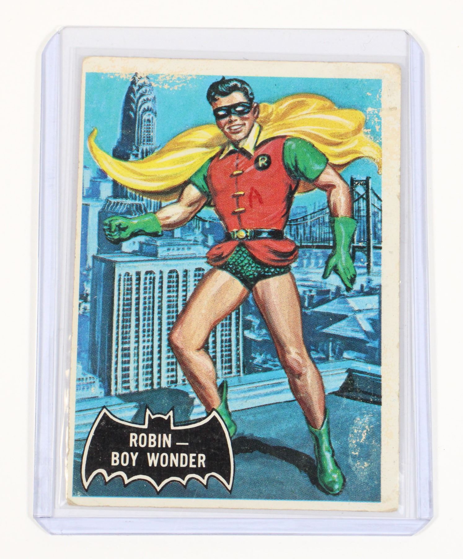 ROBIN BOY WONDER CANADIAN O-PEE-CHEE VARIATION OF TOPPS CARD, WORN CONDITION- INCLUDES PLASTIC PROTECTIVE SLEEVE AND ADDITIONAL SLEEVE. 1966 BATMAN CARD THE BATMAN