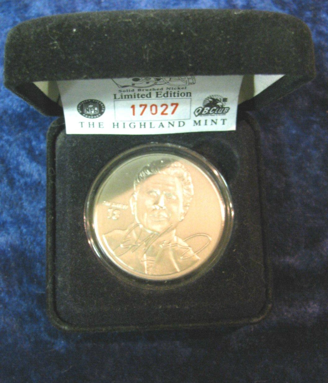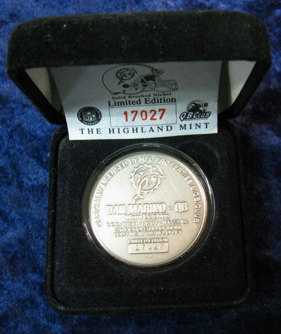 638. "Dan Marino" Limited Edition Solid Brushed Nickel Medal. Limited edition serial number 17027. Minted by the Highland Mint. 39mm. Encased. Mounted in a velvet-lined case.