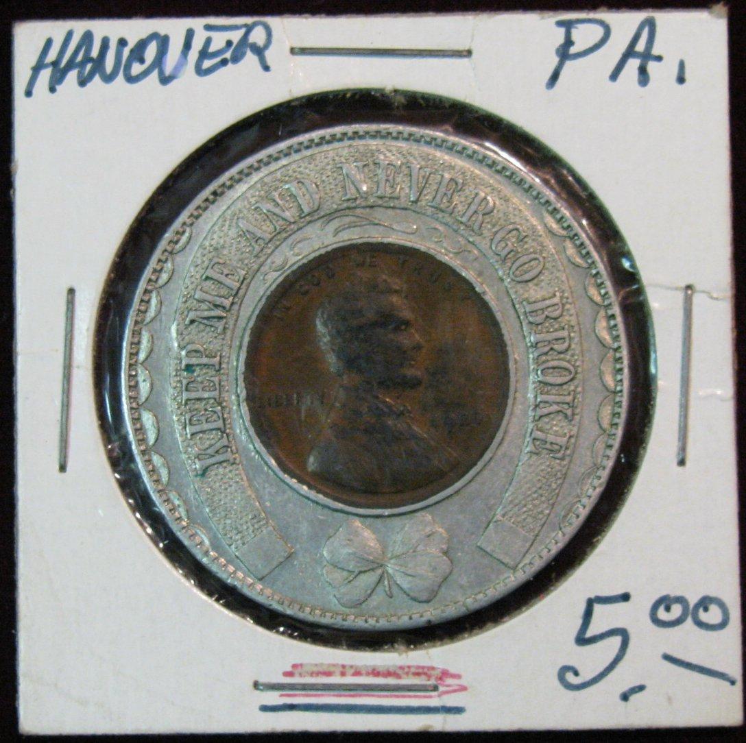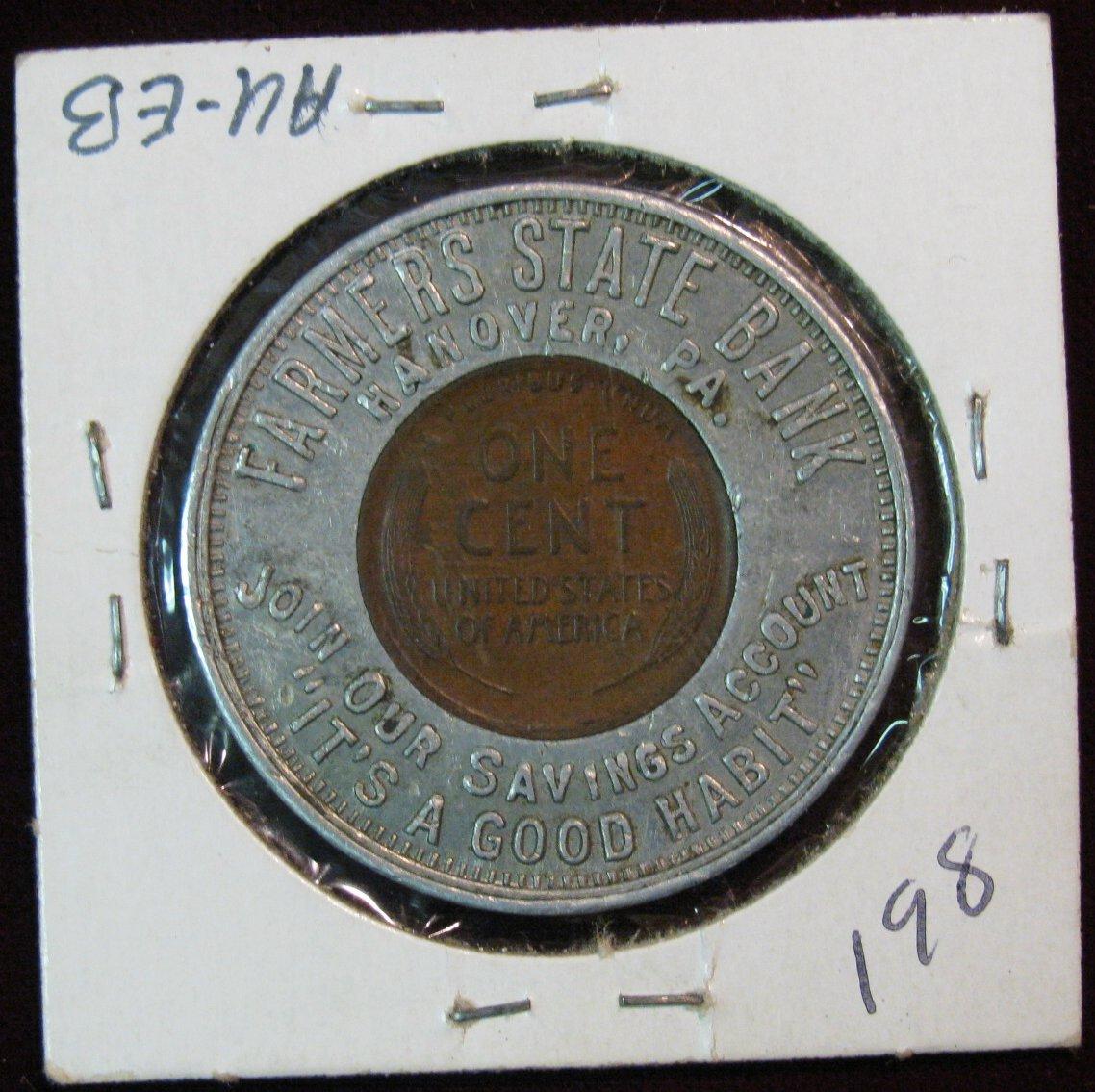 638. Encased Cent. "Farmer's State Bank/Hanover, Pa. Join our savings account it's a good habit", 1920 Lincoln Cent.