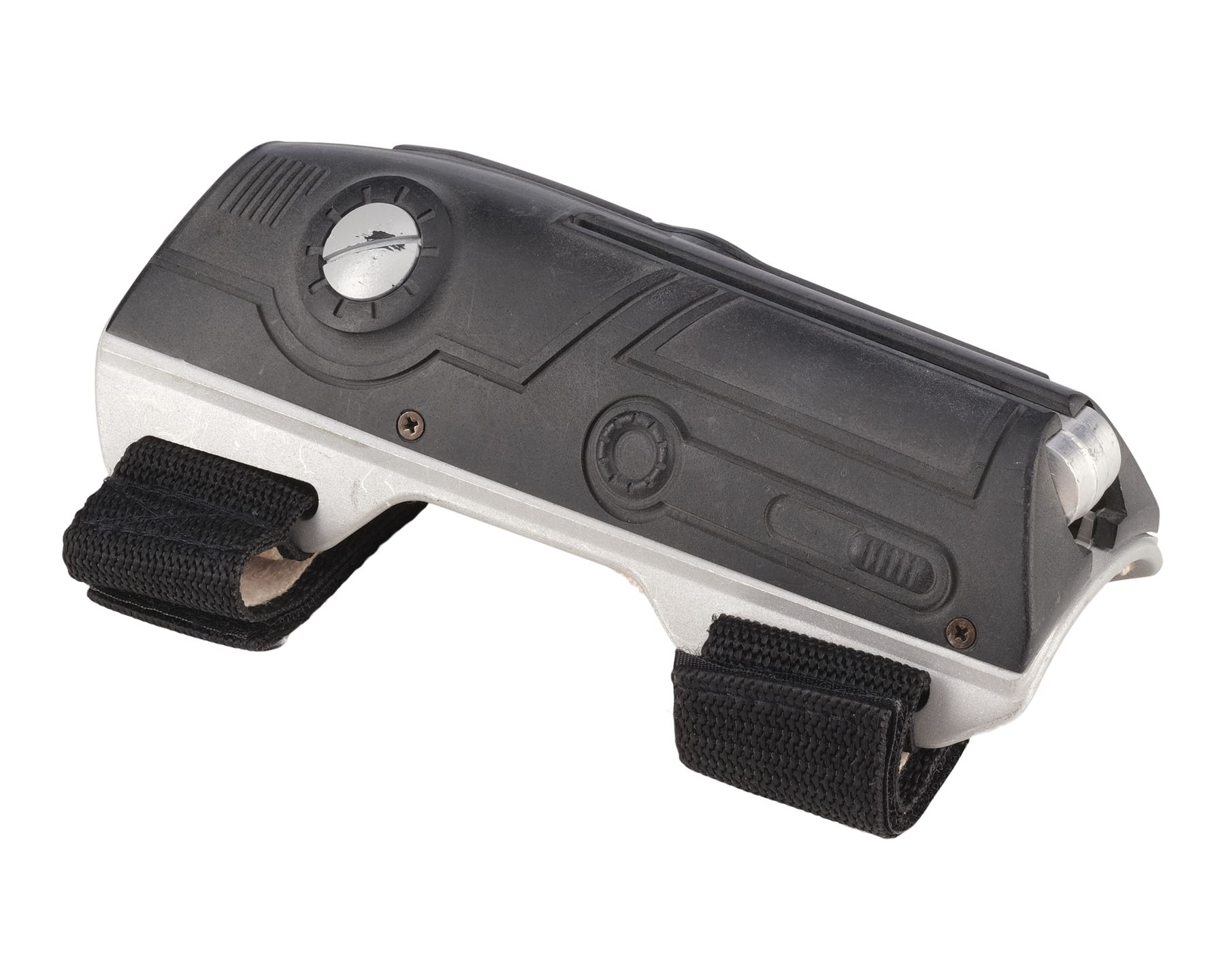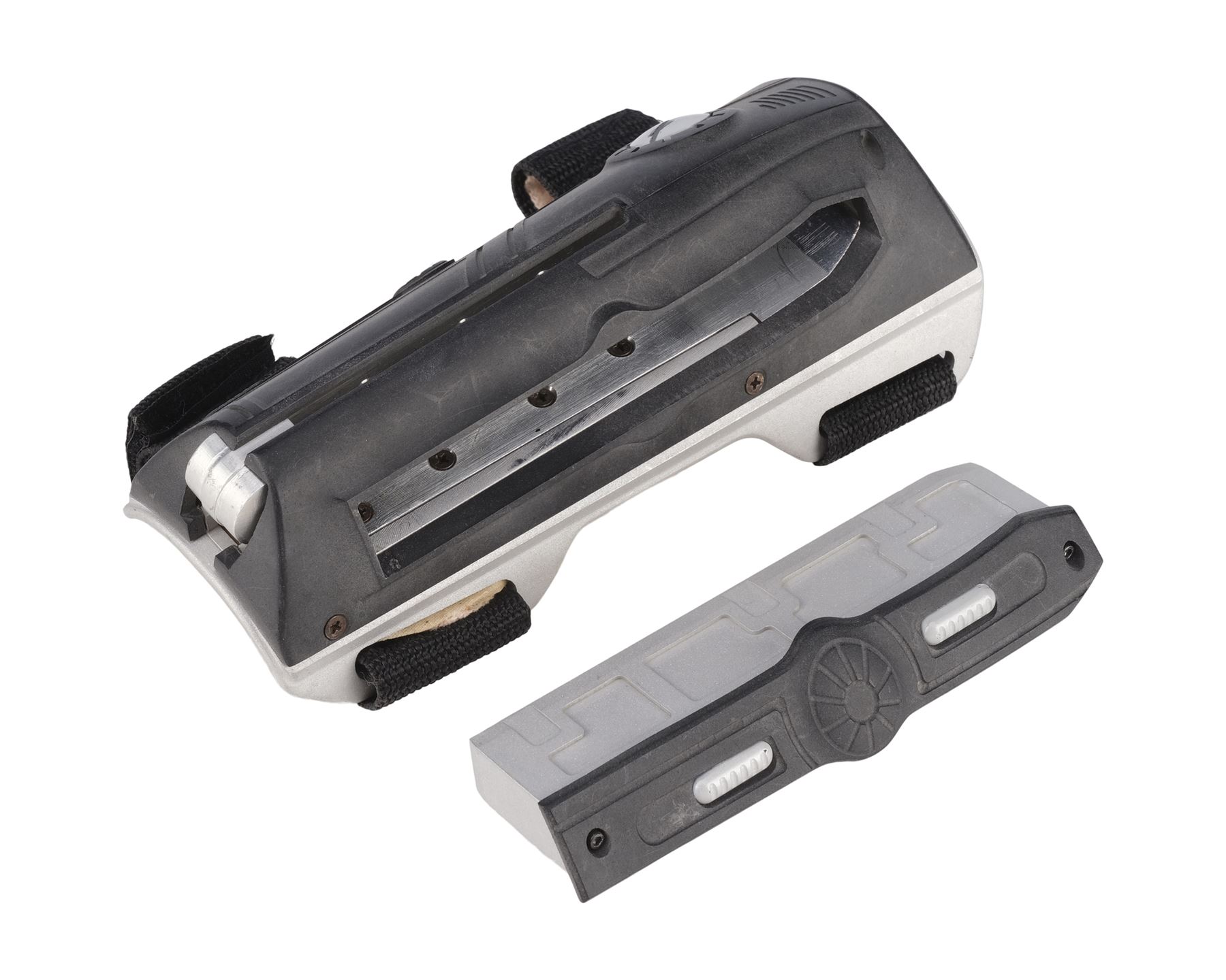 This lot consists of one metal blade in a custom-made frame, and a foam-backed resin gauntlet with webbed nylon straps that have self-adhesive strips. This lot exhibits a buildup of grime on the gauntlet in the crevices and lifted adhesive. Dimensions: (approx.) 17" x 14" x 4" (43.25 cm x 35.5 cm x 10.25 cm)
