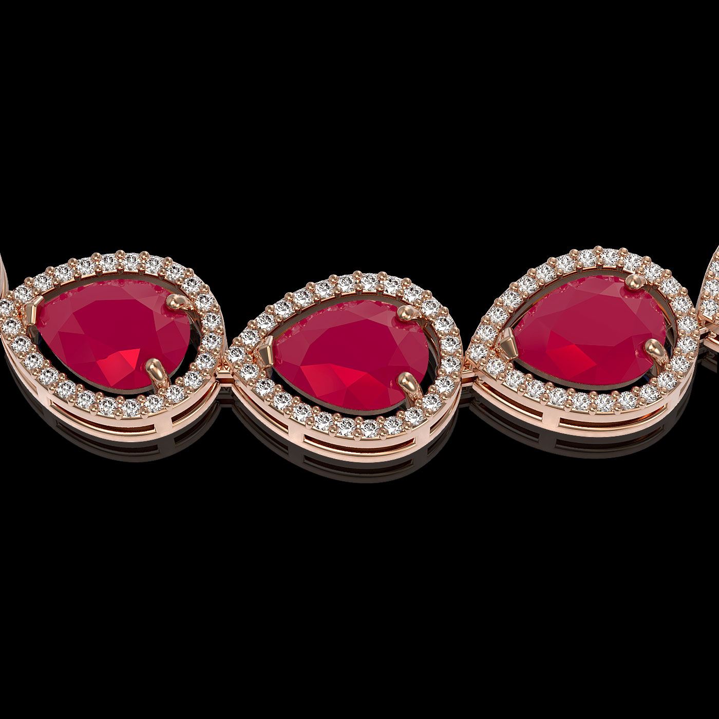 REF-785A8X -41190 ---- 64.01 CTW Ruby & Diamond Halo Necklace 10K Rose Gold ---- Luxury Designer Brand Necklace Appraised at $43,200 Certificate Number US41190 10k Rose gold, Necklace Size is 16 Inches, Necklace measuring approx. 10 mm x 16 Inches, weighing in total approx. 32 grams. Made in the USA and is stamped 10k, Main stone 57.61 carat total weight containing 32 pieces of Mid-Opaque-Deep Red color with AAA quality Pear shape cut Ruby , Stone #2 6.4 carat total weight containing 800 pieces of G-H color with VS/SI quality Round shape cut Diamond