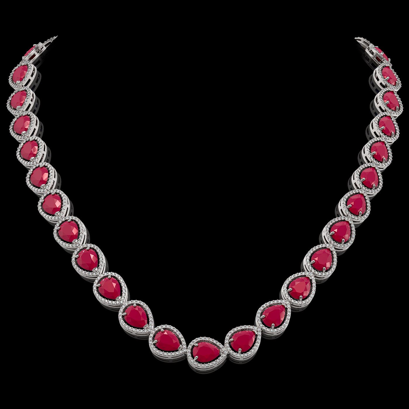REF-785M8H -41189 ---- 64.01 CTW Ruby & Diamond Halo Necklace 10K White Gold ---- Luxury Designer Brand Necklace Appraised at $43,200 Certificate Number US41189 10k White gold, Necklace Size is 16 Inches, Necklace measuring approx. 10 mm x 16 Inches, weighing in total approx. 32 grams. Made in the USA and is stamped 10k, Main stone 57.61 carat total weight containing 32 pieces of Mid-Opaque-Deep Red color with AAA quality Pear shape cut Ruby , Stone #2 6.4 carat total weight containing 800 pieces of G-H color with VS/SI quality Round shape cut Diamond
