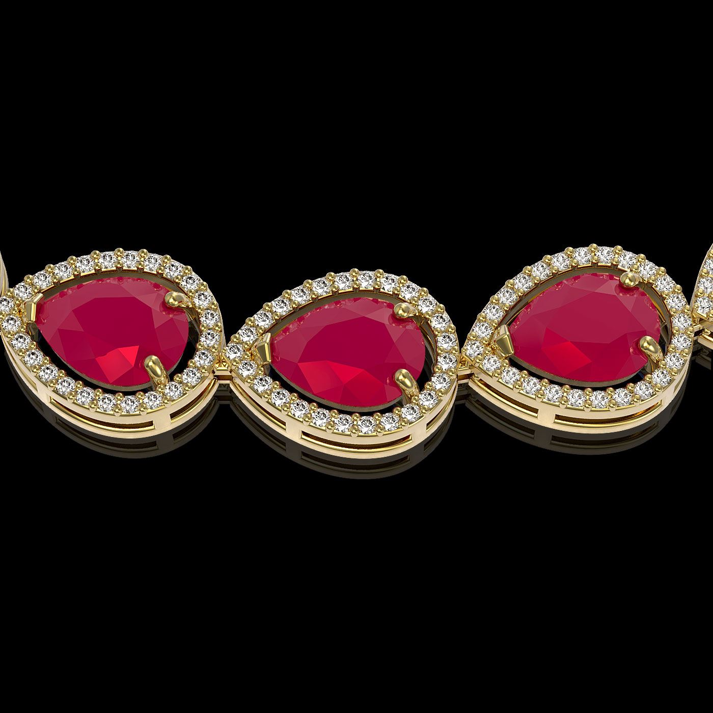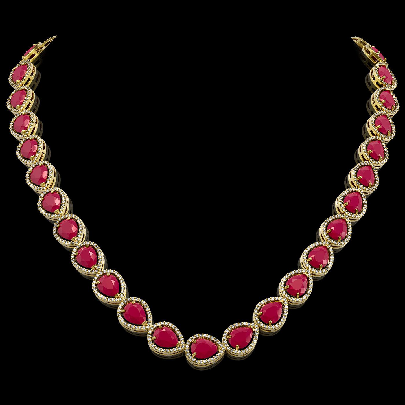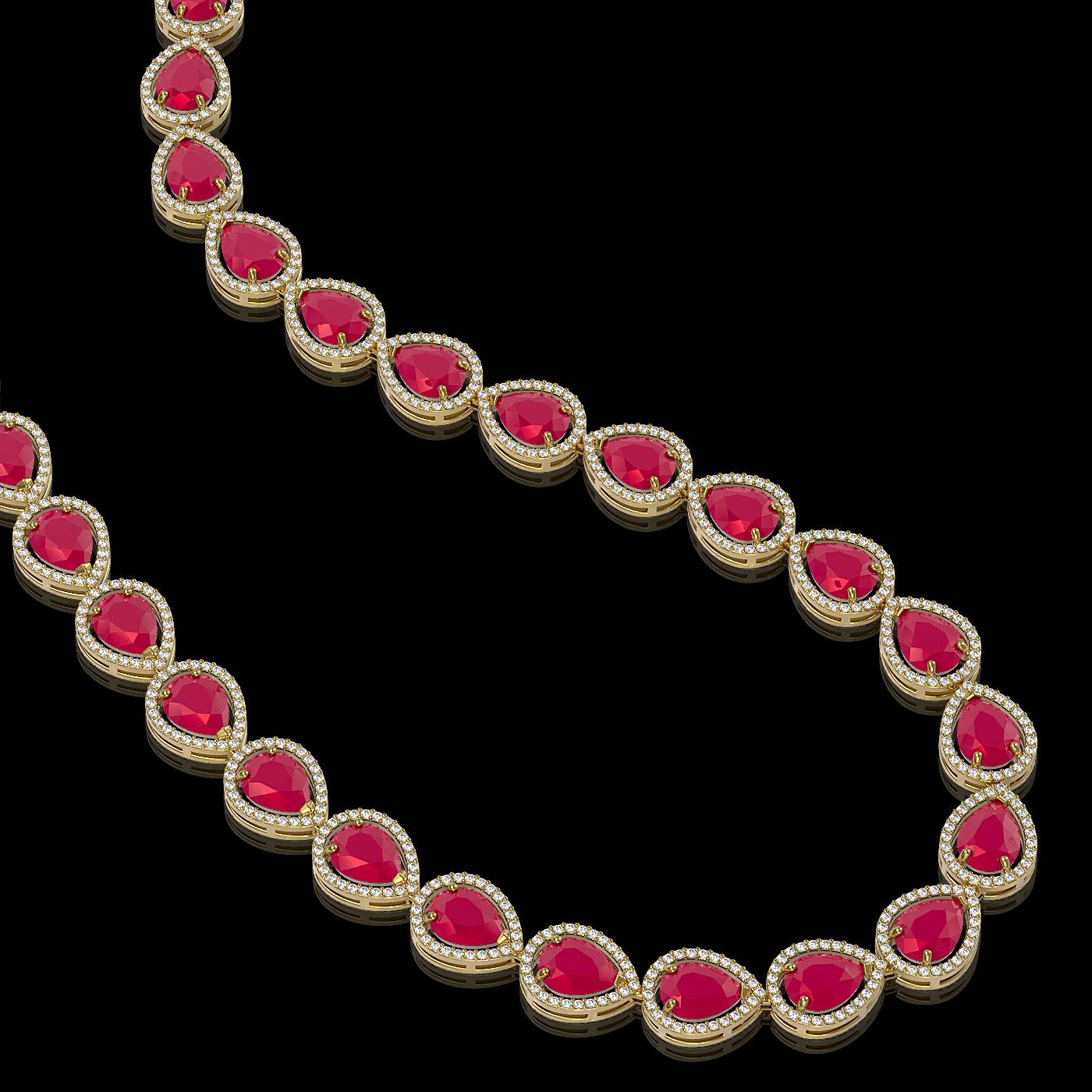 REF-785X8T -41191 ---- 64.01 CTW Ruby & Diamond Halo Necklace 10K Yellow Gold ---- Luxury Designer Brand Necklace Appraised at $43,200 Certificate Number US41191 10k Yellow gold, Necklace Size is 16 Inches, Necklace measuring approx. 10 mm x 16 Inches, weighing in total approx. 32 grams. Made in the USA and is stamped 10k, Main stone 57.61 carat total weight containing 32 pieces of Mid-Opaque-Deep Red color with AAA quality Pear shape cut Ruby , Stone #2 6.4 carat total weight containing 800 pieces of G-H color with VS/SI quality Round shape cut Diamond