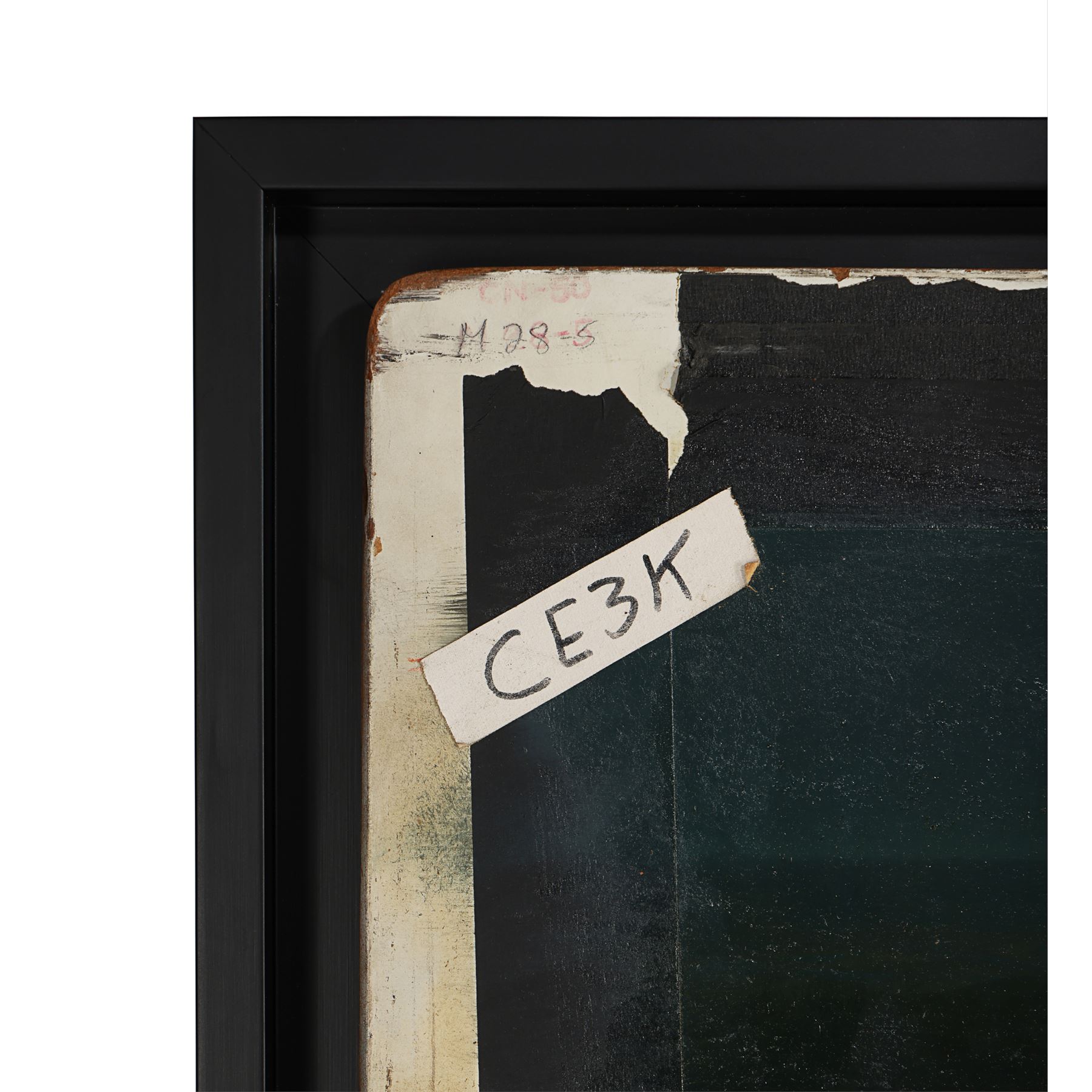 This painting features acrylic paints on masonite with a black wash for live-action photography overlap. "CE3K" is handwritten on pieces of tape in two corners and there are additional handwritten numbers in some of the corners. Black masking tape is present along some of the edges.