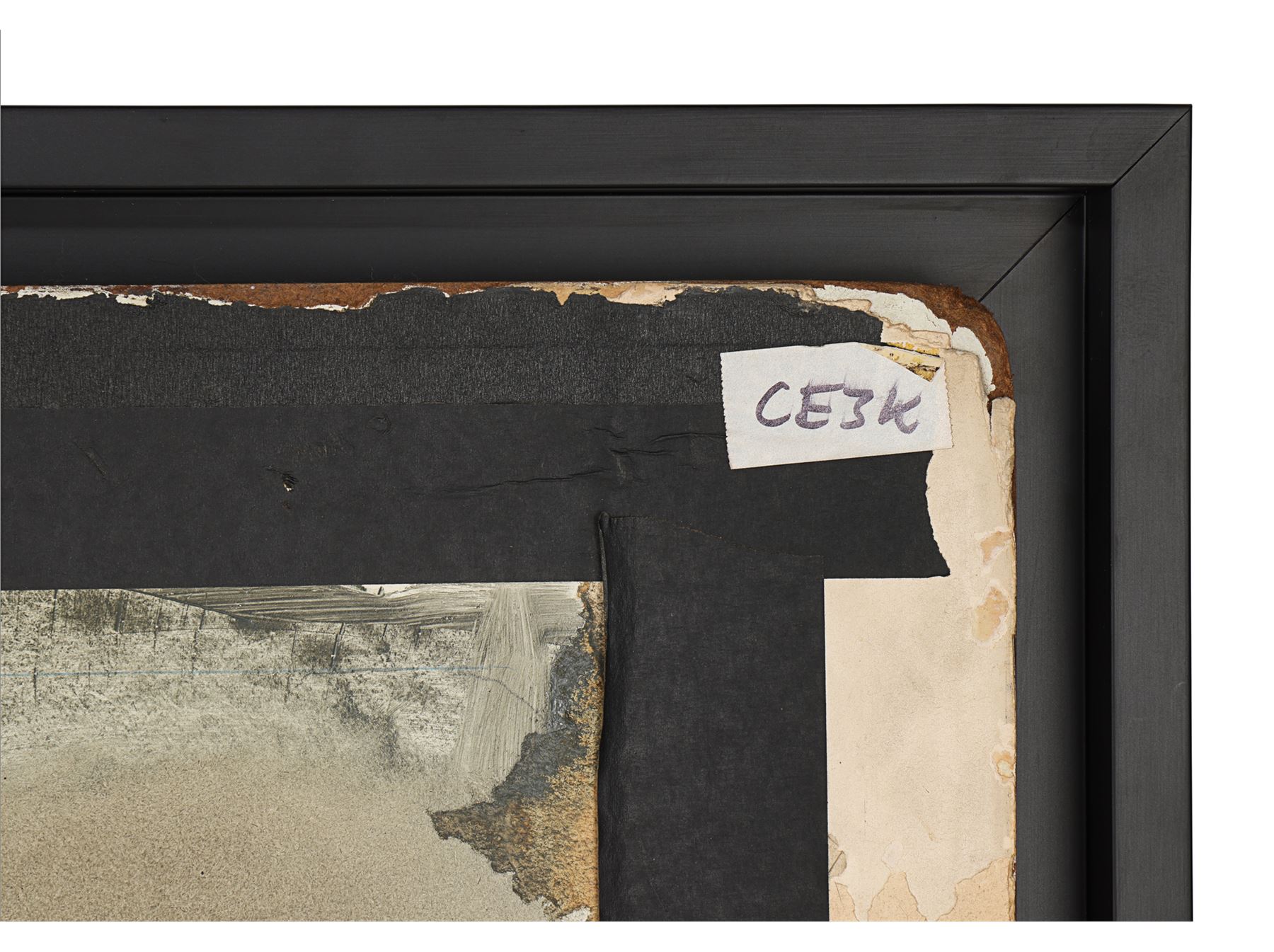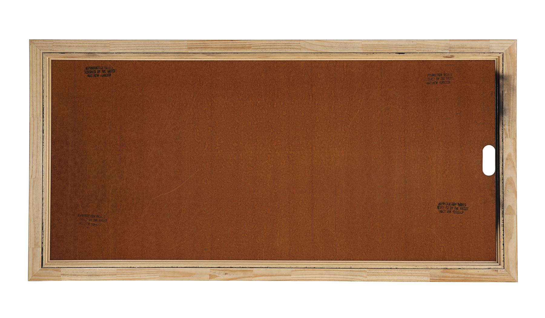The painting is held in a custom-made black wooden frame. The painting exhibits some wear from age and storage, including some small chips and some staining. Dimensions: framed) 41.25" x 83" x 2.25" (104.5 cm x 211 cm x 5.5 cm)